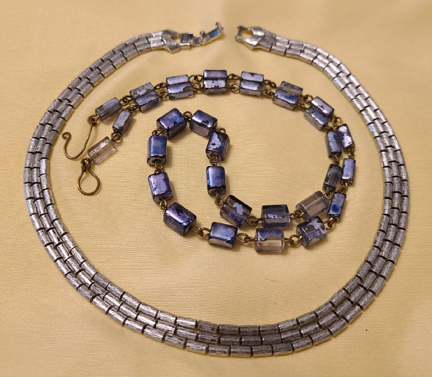 Here's are two lovely vintage necklaces up for grabs! One necklace features a unique silver tone design with other colours. The other necklace is silver played. There necklaces are a great find for any vintage jewelry lover! Pick up only. No delivery. Price negotiable.