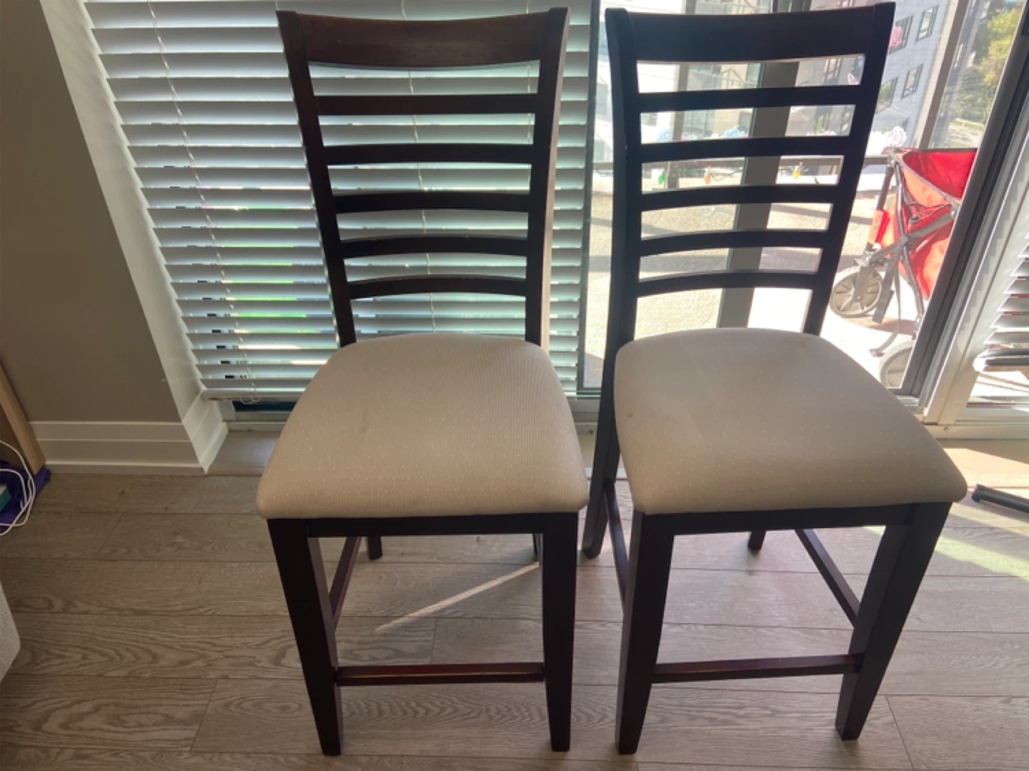 Selling a set of two wooden bar stool chairs. They're in good condition and would look great in any dining room or kitchen! The seats are upholstered with a neutral fabric. Price is negotiable.