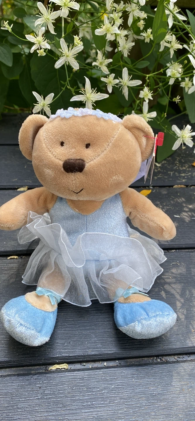 This adorable teddy bear is dressed as a ballerina, complete with a blue dress and matching shoes! It's in great condition and ready for a new home. Perfect for a child's room or as a cute addition to any collection