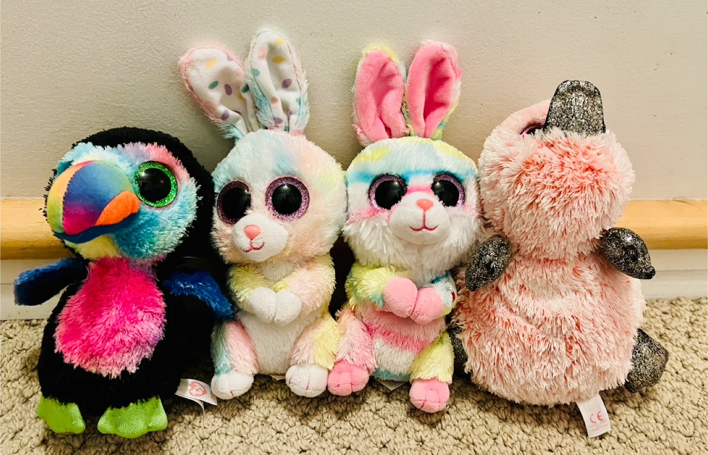 Selling a cute set of four Ty Beanie Boos plush toys! Includes a colourful toucan, two adorable bunnies with pastel tie-dye fur, and a pink bird with sparkly accents. They're all in great condition and ready for a new home