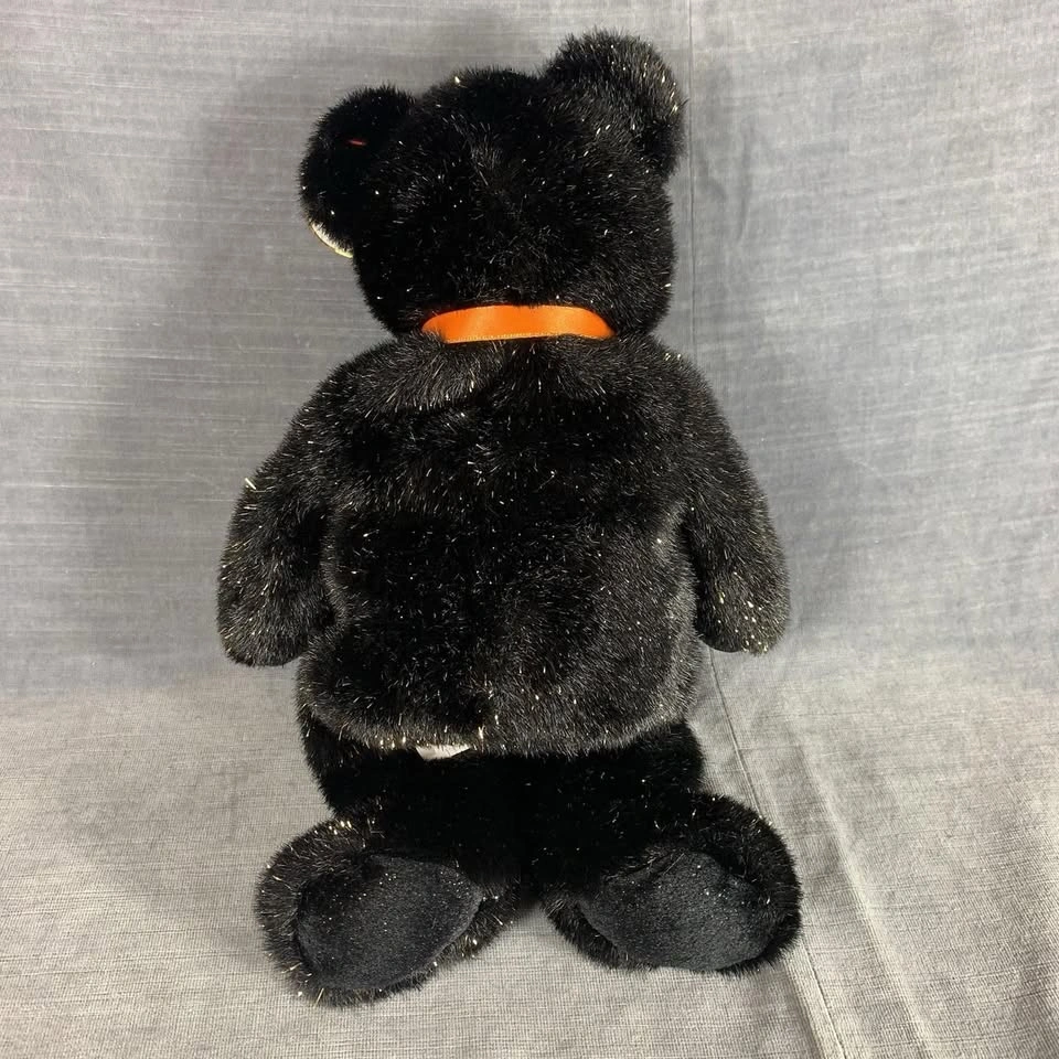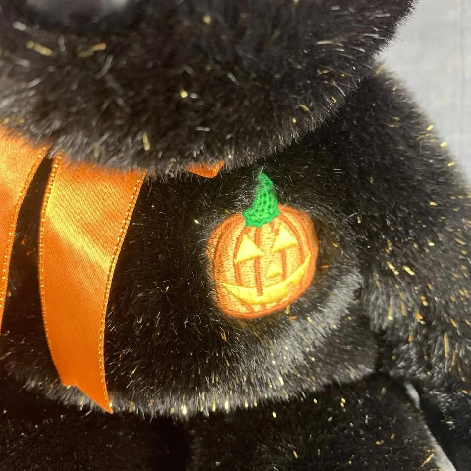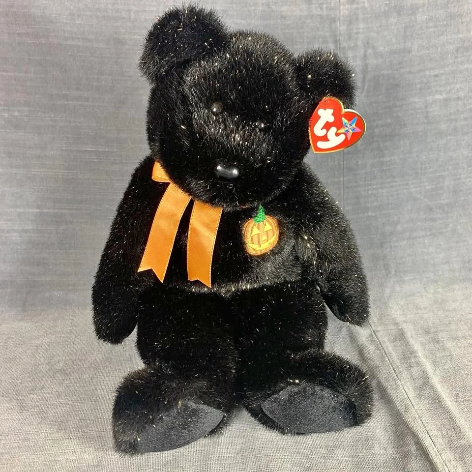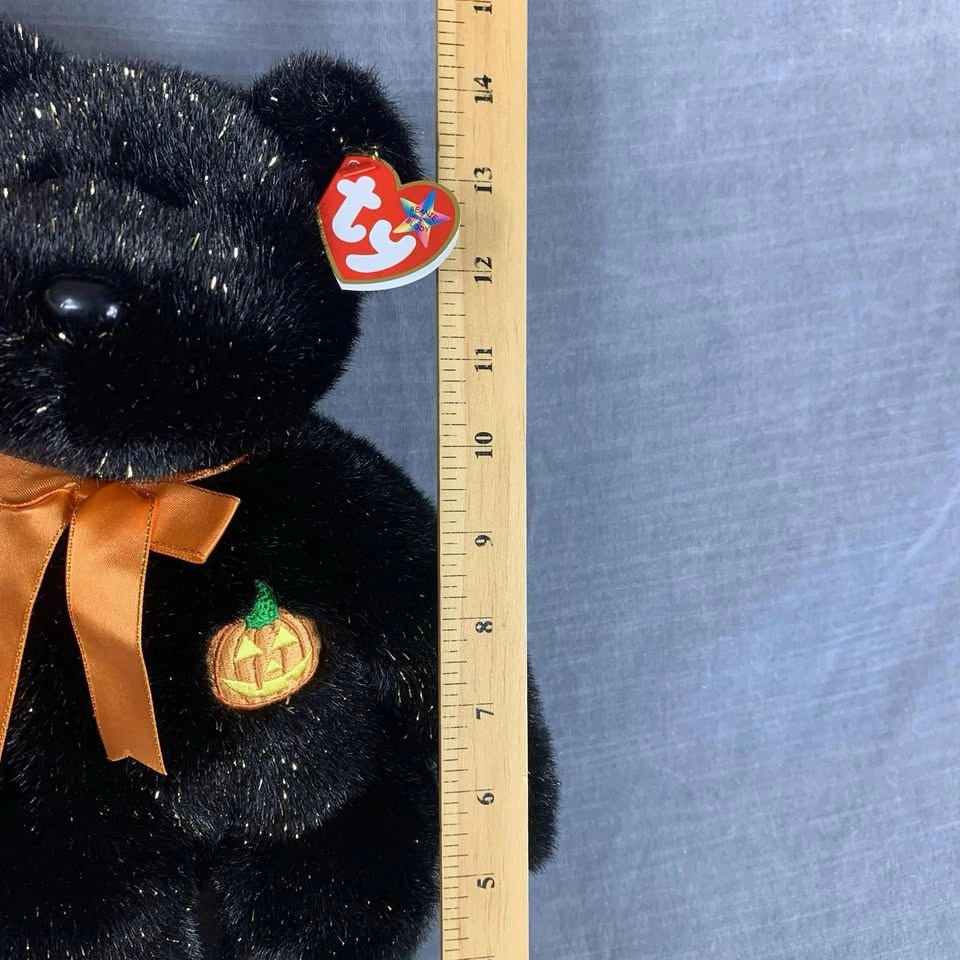 This is a preowned TY Beanie Buddy “Haunt” Halloween bear from 2002. It stands approximately 13 inches tall and features black plush fur with gold sparkles, an orange satin bow, and an embroidered jack-o’-lantern on its chest. Both the swing tag and tush tag are attached and in good condition. A perfect collectible for TY fans or Halloween enthusiasts. Made with 100% Tylon and filled with polyester fiber & PE pellets. Handmade in China. A great seasonal addition to any Beanie Babies or plush toy collection. Condition: Very good preowned condition. Please see all photos for details. From a smoke-free home.