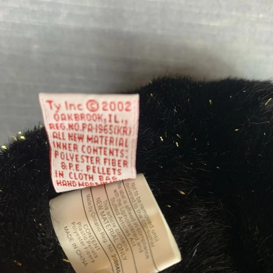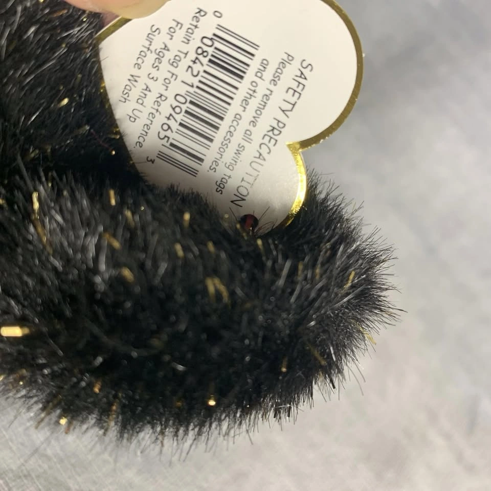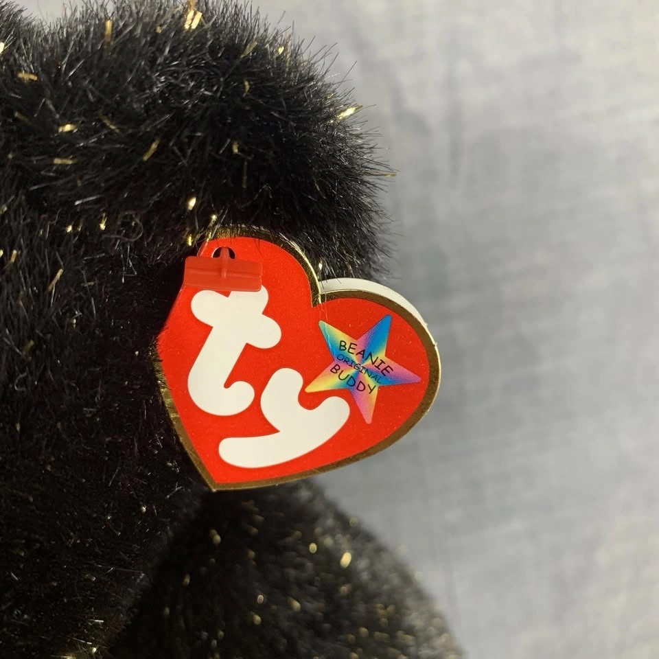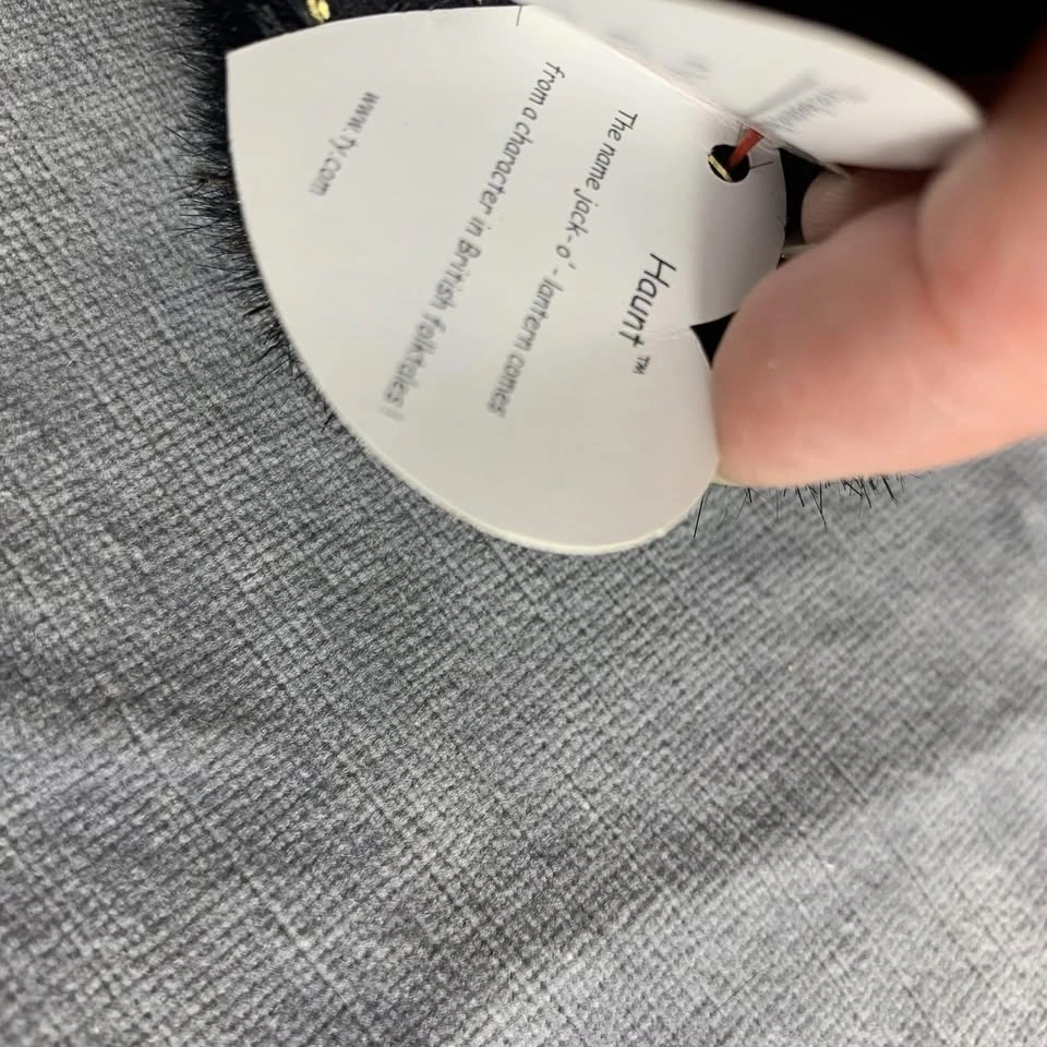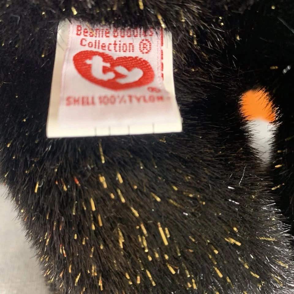 This is a preowned TY Beanie Buddy “Haunt” Halloween bear from 2002. It stands approximately 13 inches tall and features black plush fur with gold sparkles, an orange satin bow, and an embroidered jack-o’-lantern on its chest. Both the swing tag and tush tag are attached and in good condition. A perfect collectible for TY fans or Halloween enthusiasts. Made with 100% Tylon and filled with polyester fiber & PE pellets. Handmade in China. A great seasonal addition to any Beanie Babies or plush toy collection. Condition: Very good preowned condition. Please see all photos for details. From a smoke-free home.