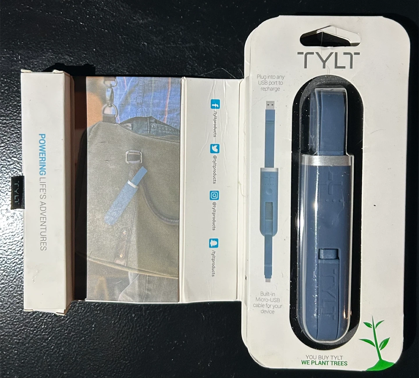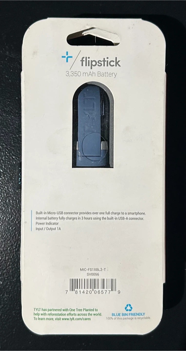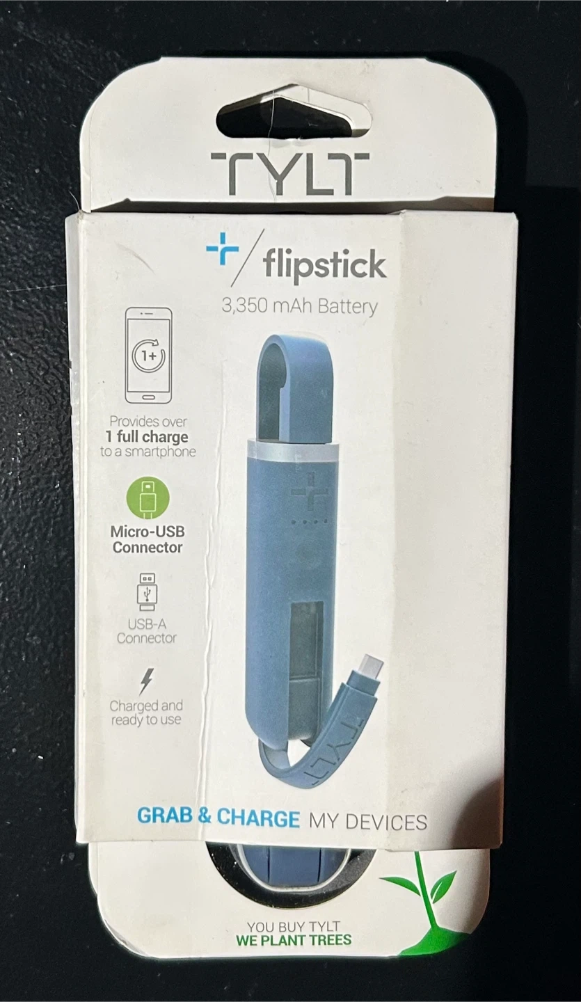 Selling a brand new TYLT Flipstick portable charger! It's a 3350 mAh battery pack, perfect for giving your smartphone one full charge while you're on the go. Features a built-in Micro-USB connector and recharges using a standard USB-A port. Grab and charge your devices with this handy little gadget!