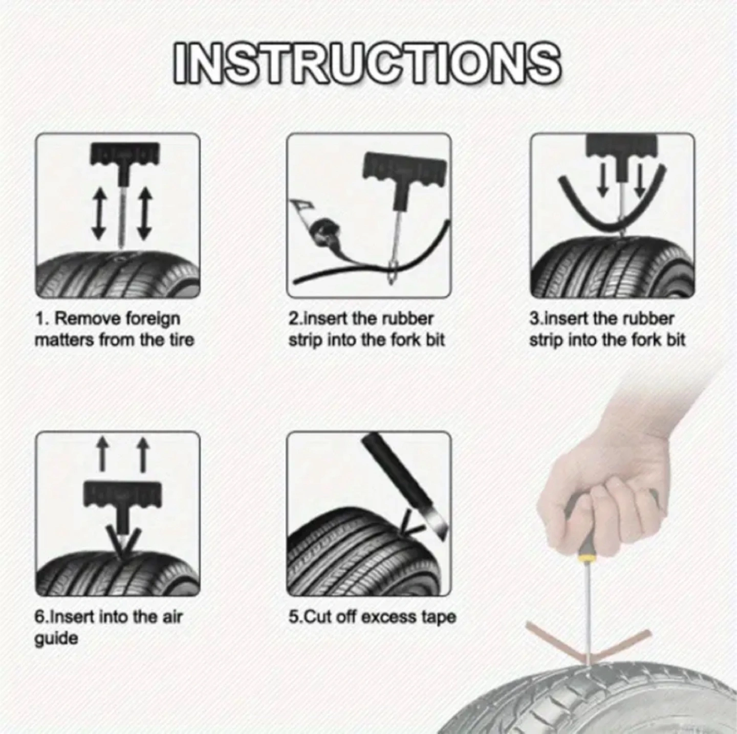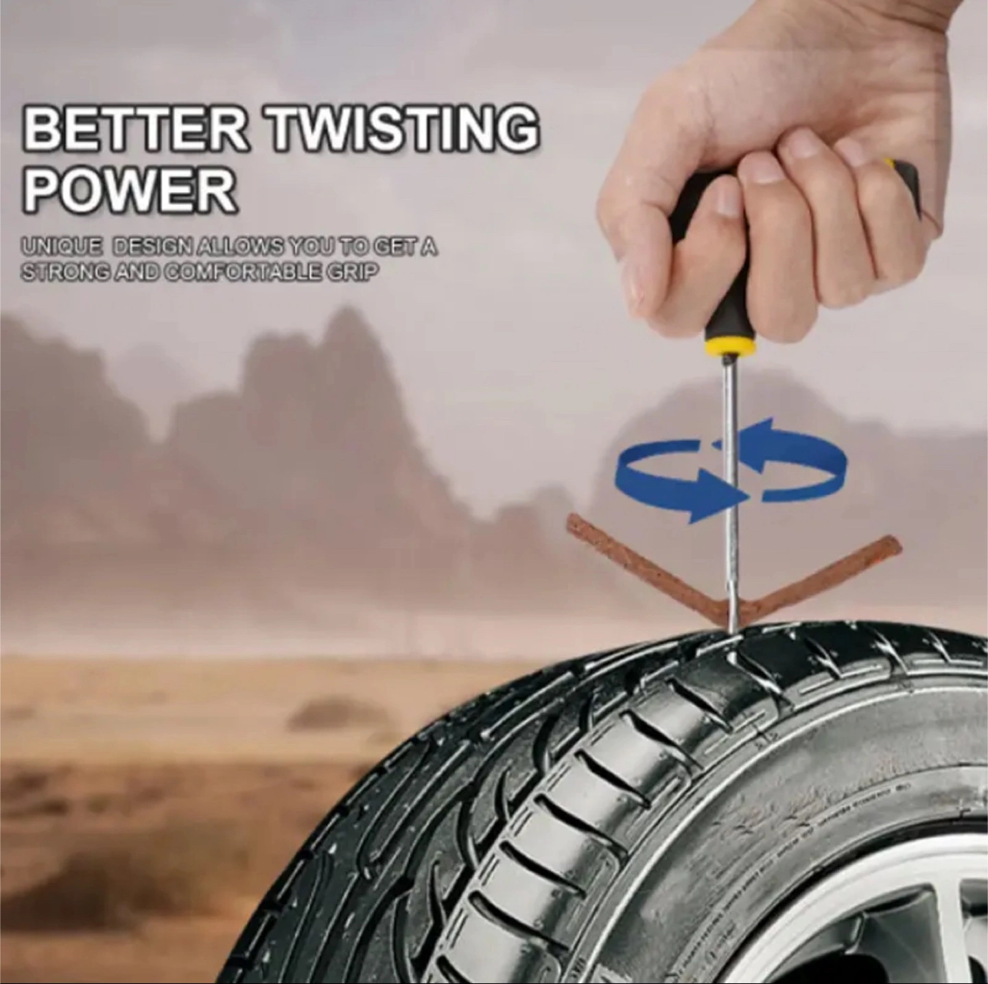 This tyre repair kit is designed for super adhesion and wear resistance, ensuring a long service life for your tires. It features a unique design for better twisting power and a strong, comfortable grip. The kit includes tools and rubber strips to get you back on the road quickly and easily