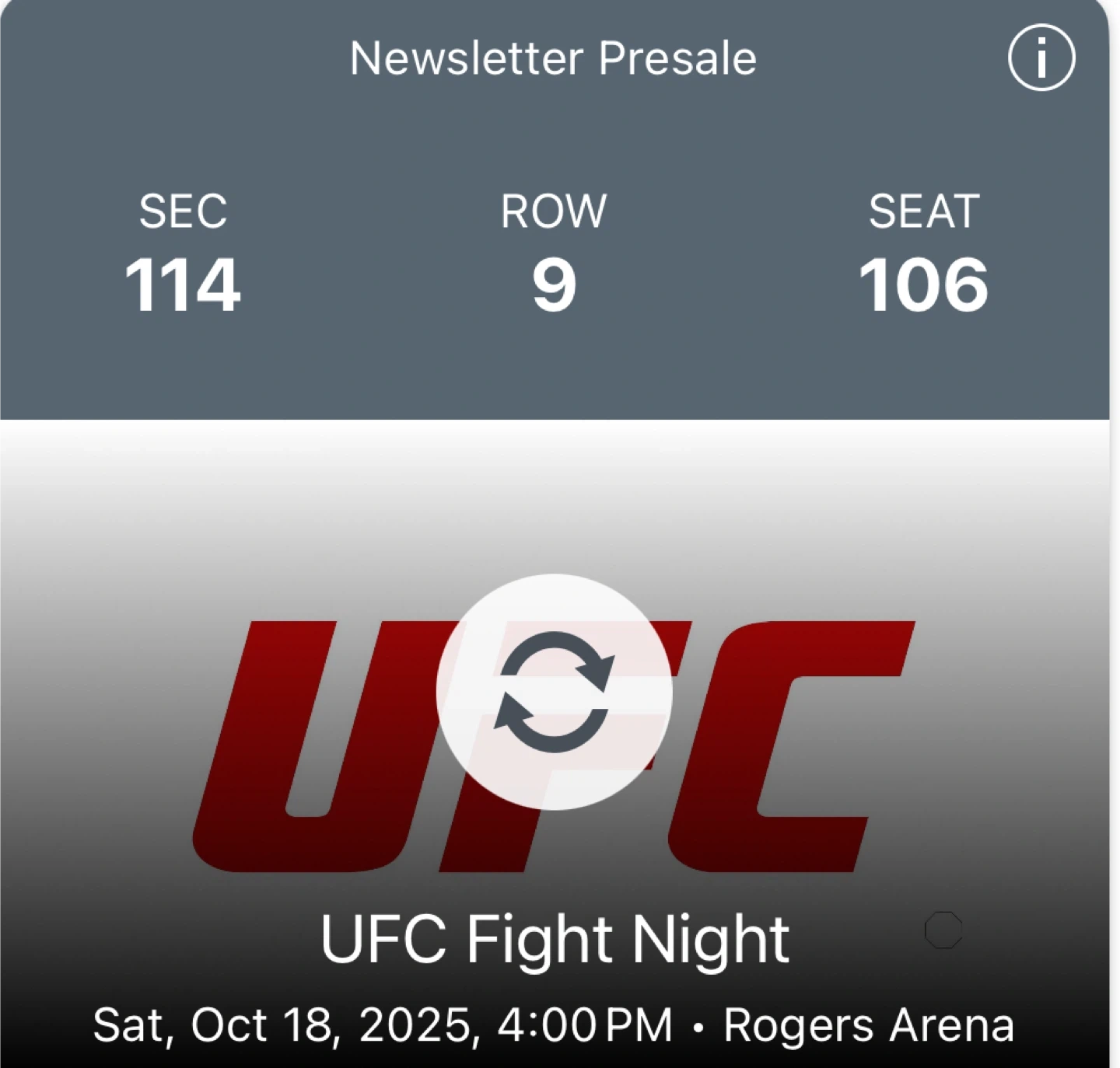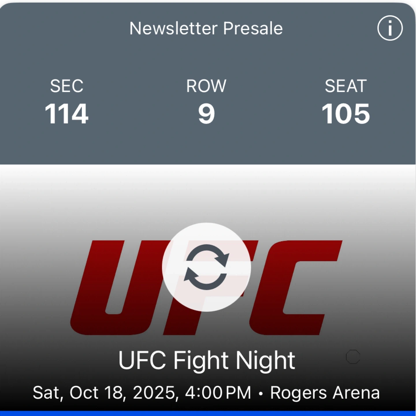 I'm selling two tickets to UFC Fight Night at Rogers Arena on Saturday, October 18, 2025 at 4:00 PM Section 114 Row 9 Seat 105 & 106 Unfortunately not able to go. Can meet at a police station or somewhere that feels secure. :)