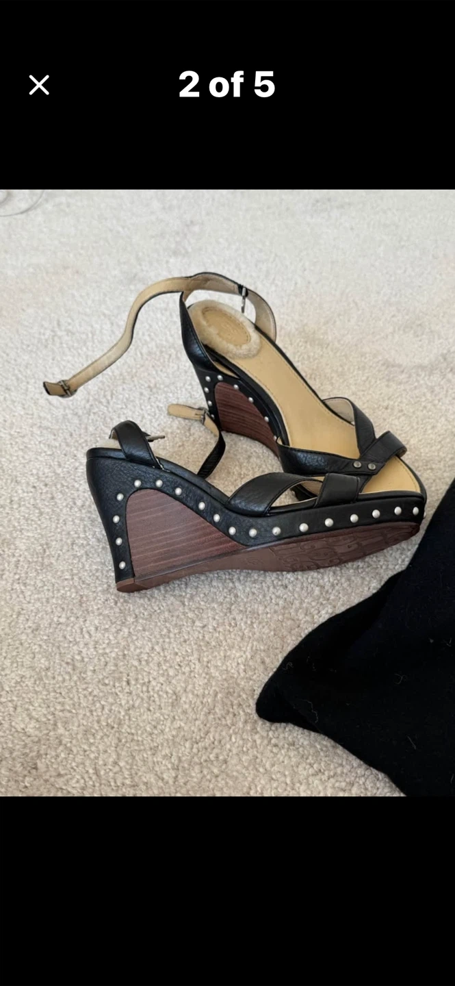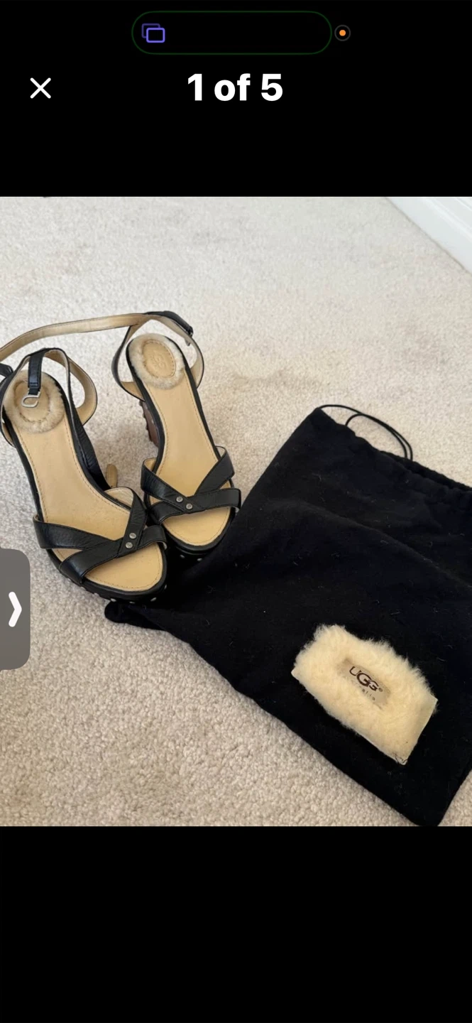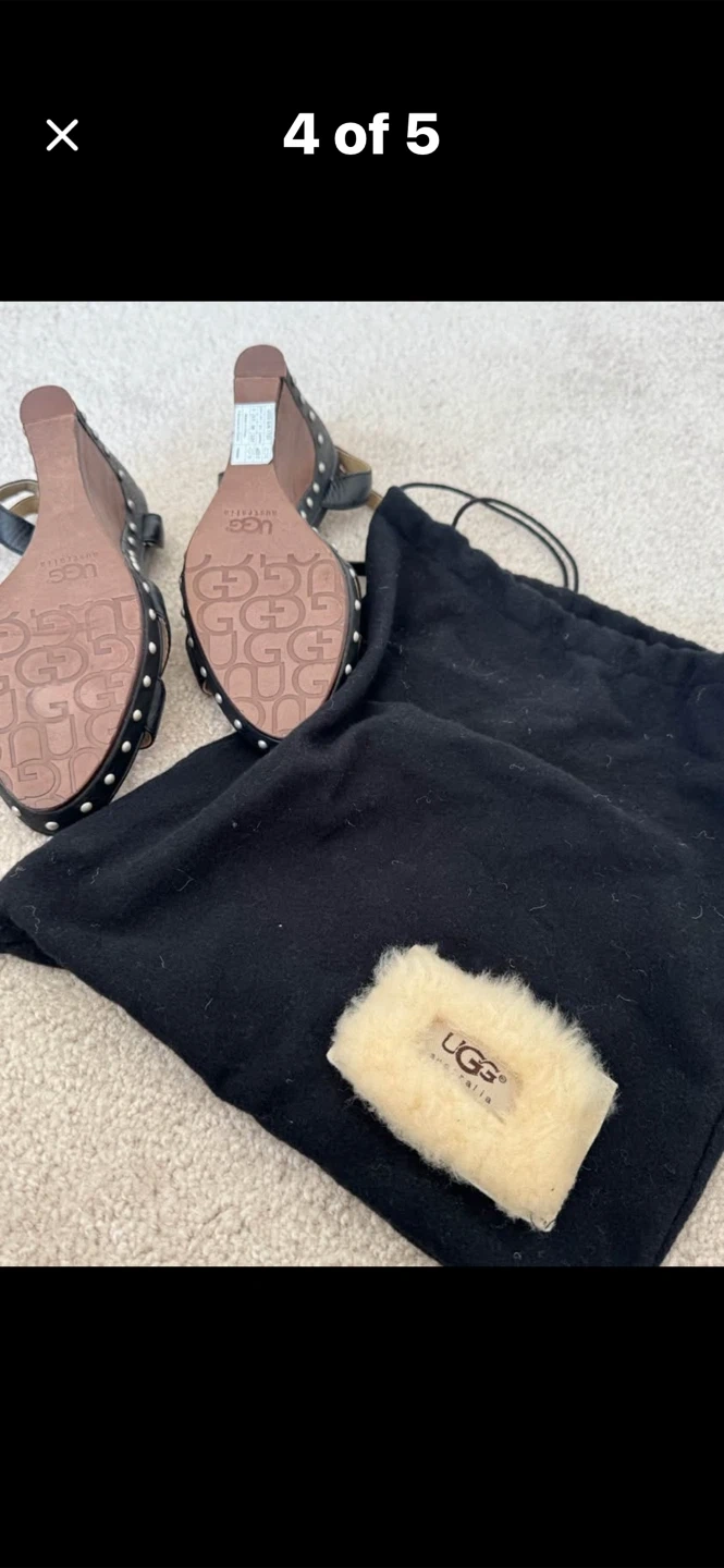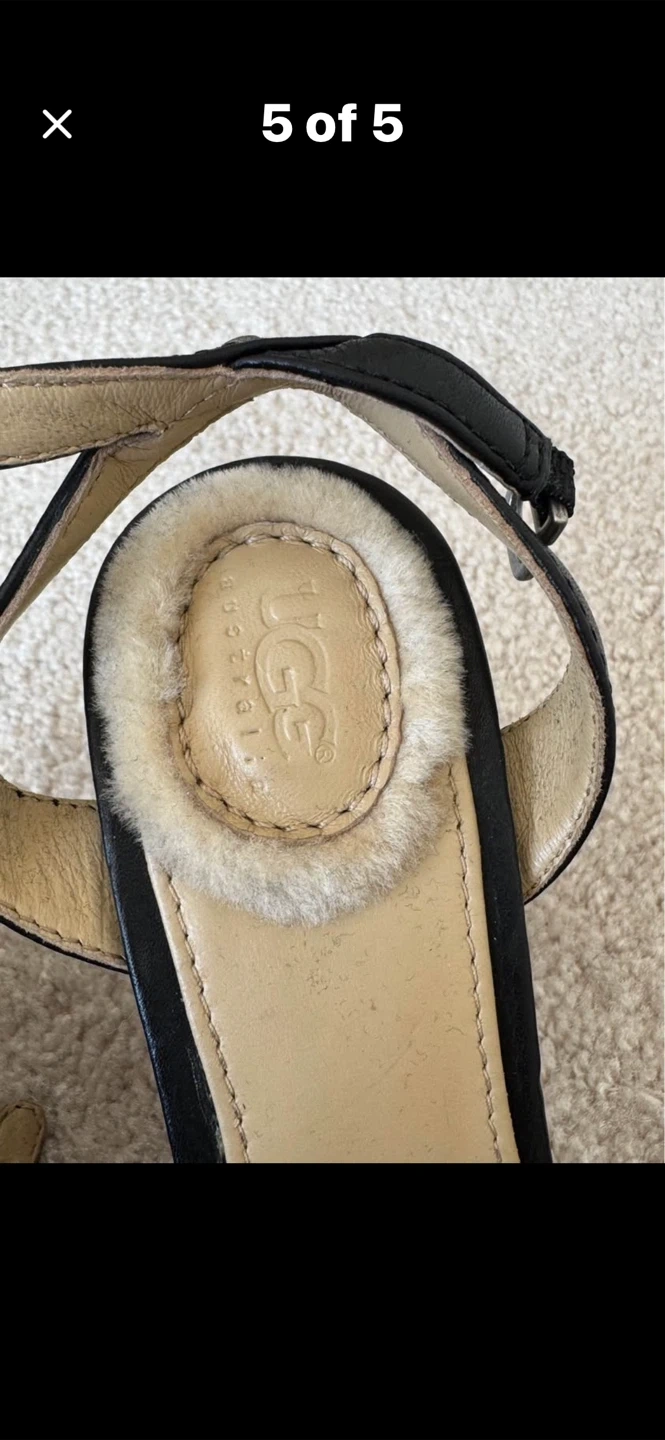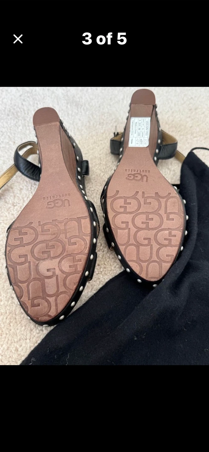 These are a pair of UGG Australia wedge sandals in black leather. They are in good condition and come with a dust bag. Size 5