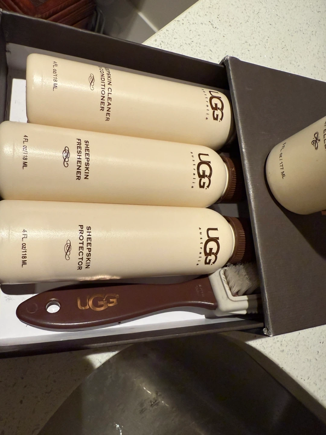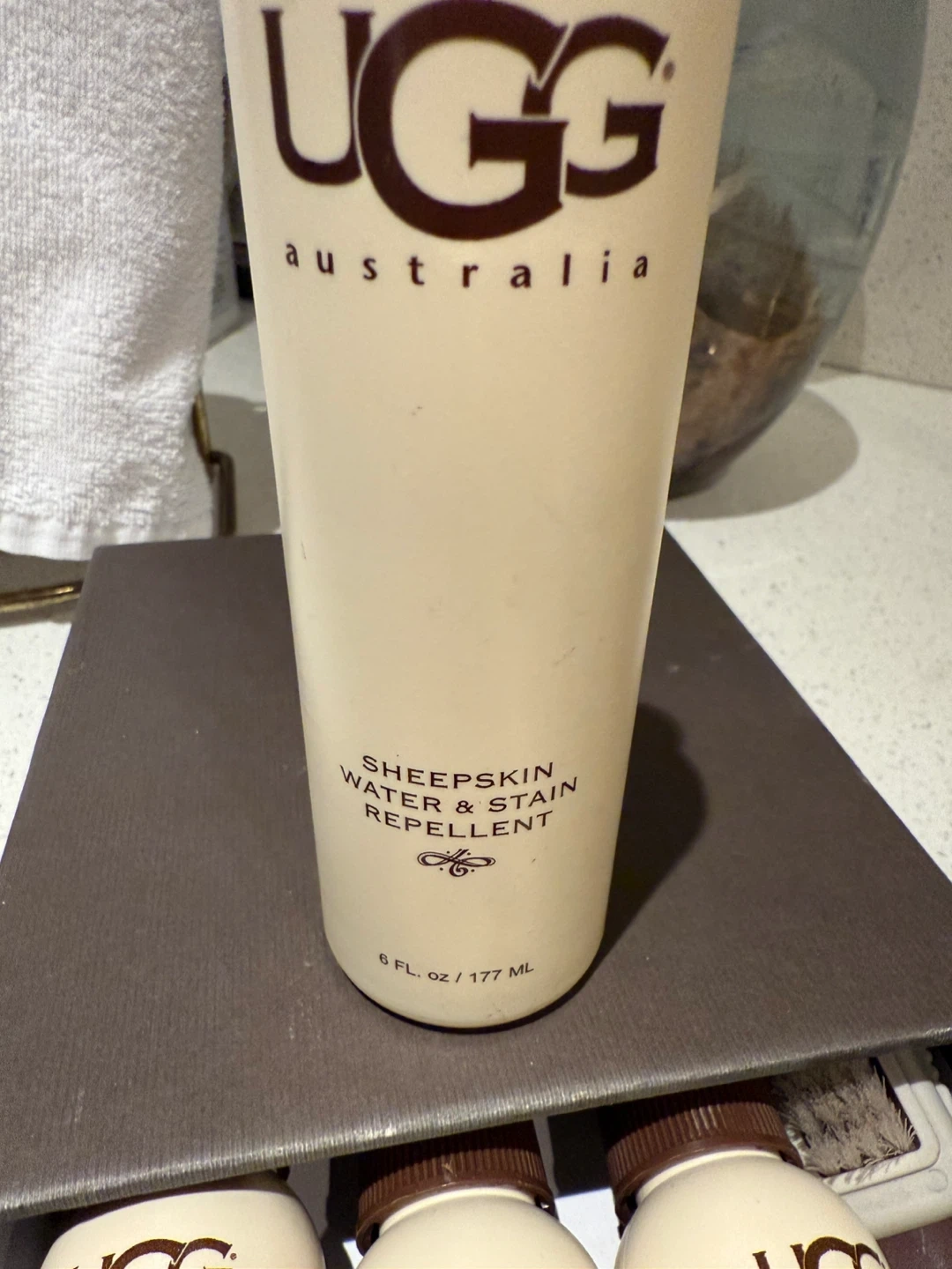 Keep your UGGs looking their best with this Sheepskin Care Kit! Includes: - Sheepskin Cleaner & Conditioner - Sheepskin Freshener - Sheepskin Protector - Brush Each bottle contains 4 fl oz / 118 mL of cleaner, freshener, and protector. The stain repellent bottle is 6 fl oz / 177 mL. Comes with the original box!
