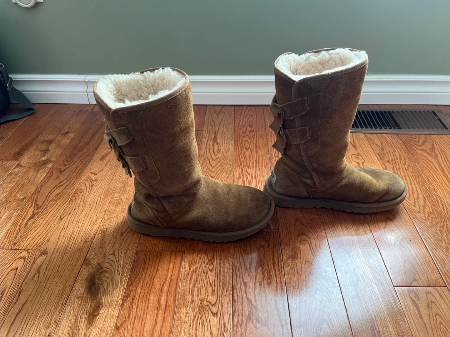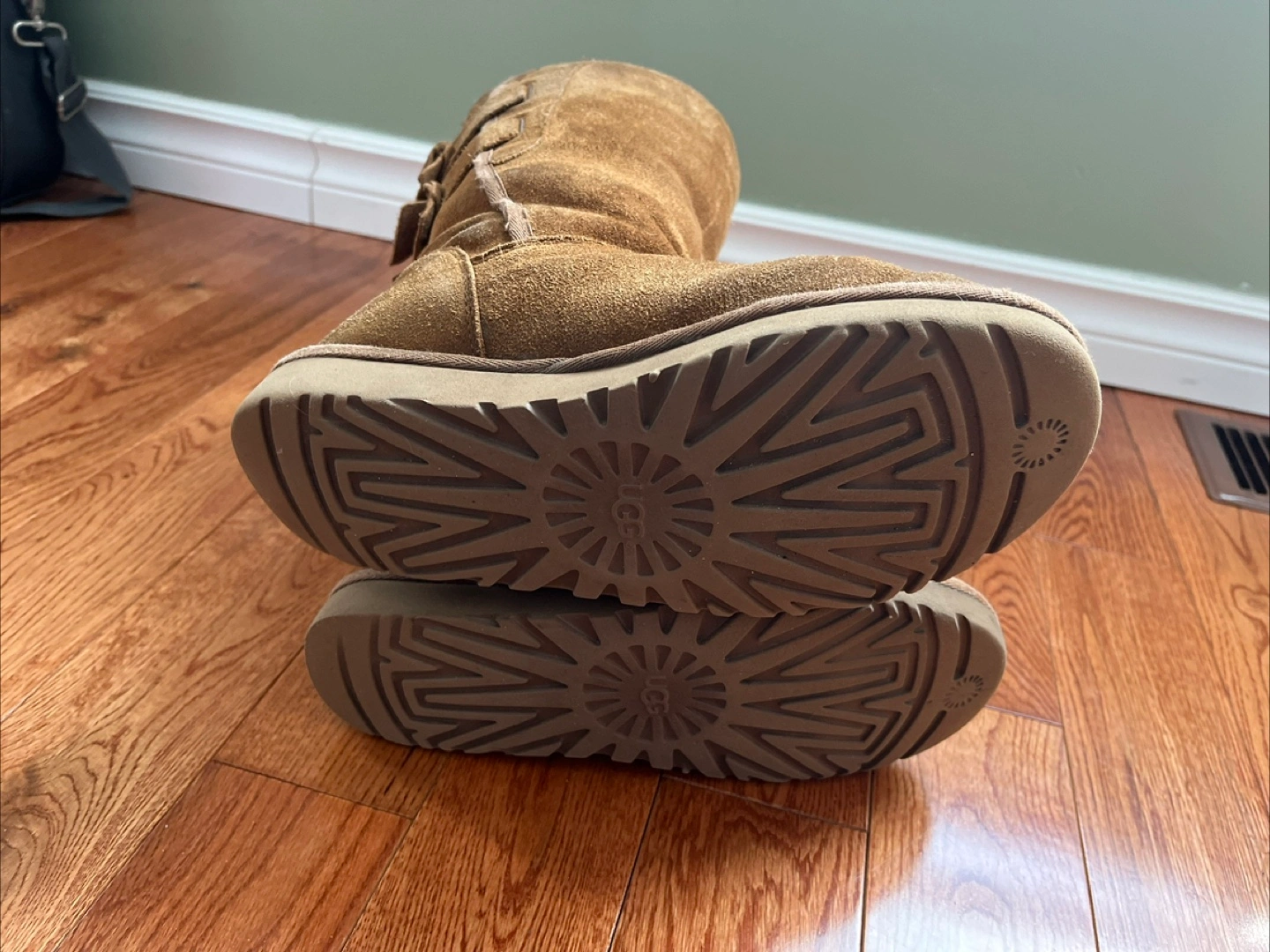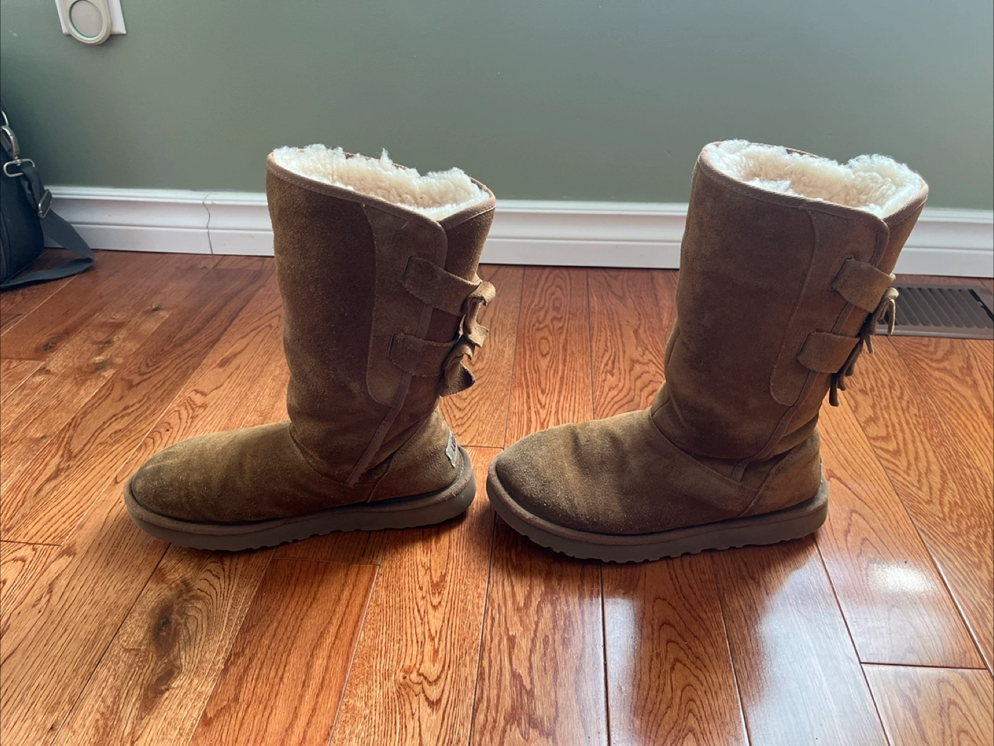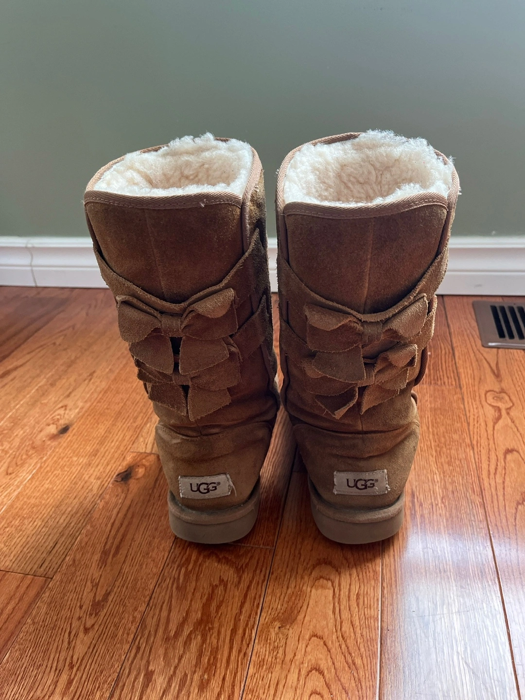 Cozy UGG Bailey Bow boots in a women's size 7! These are perfect for keeping your feet warm and stylish during the colder months. Some wear, but still have lots of life left in them!