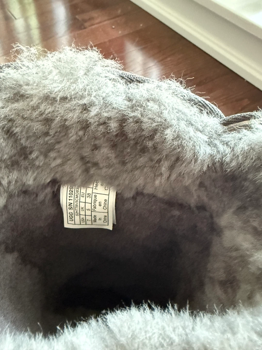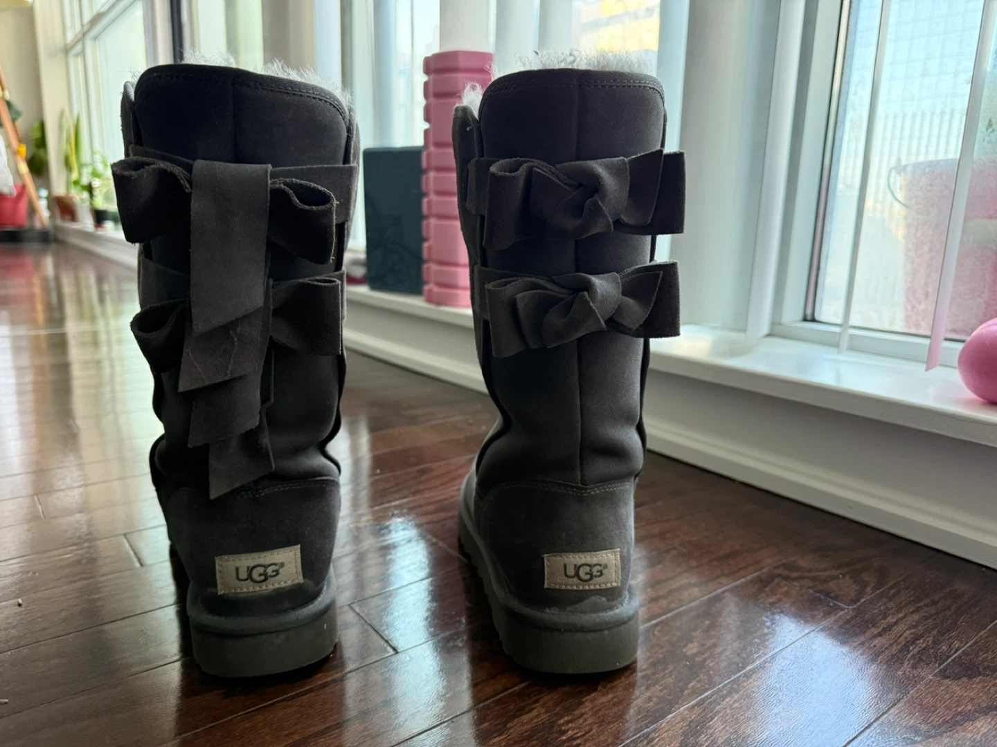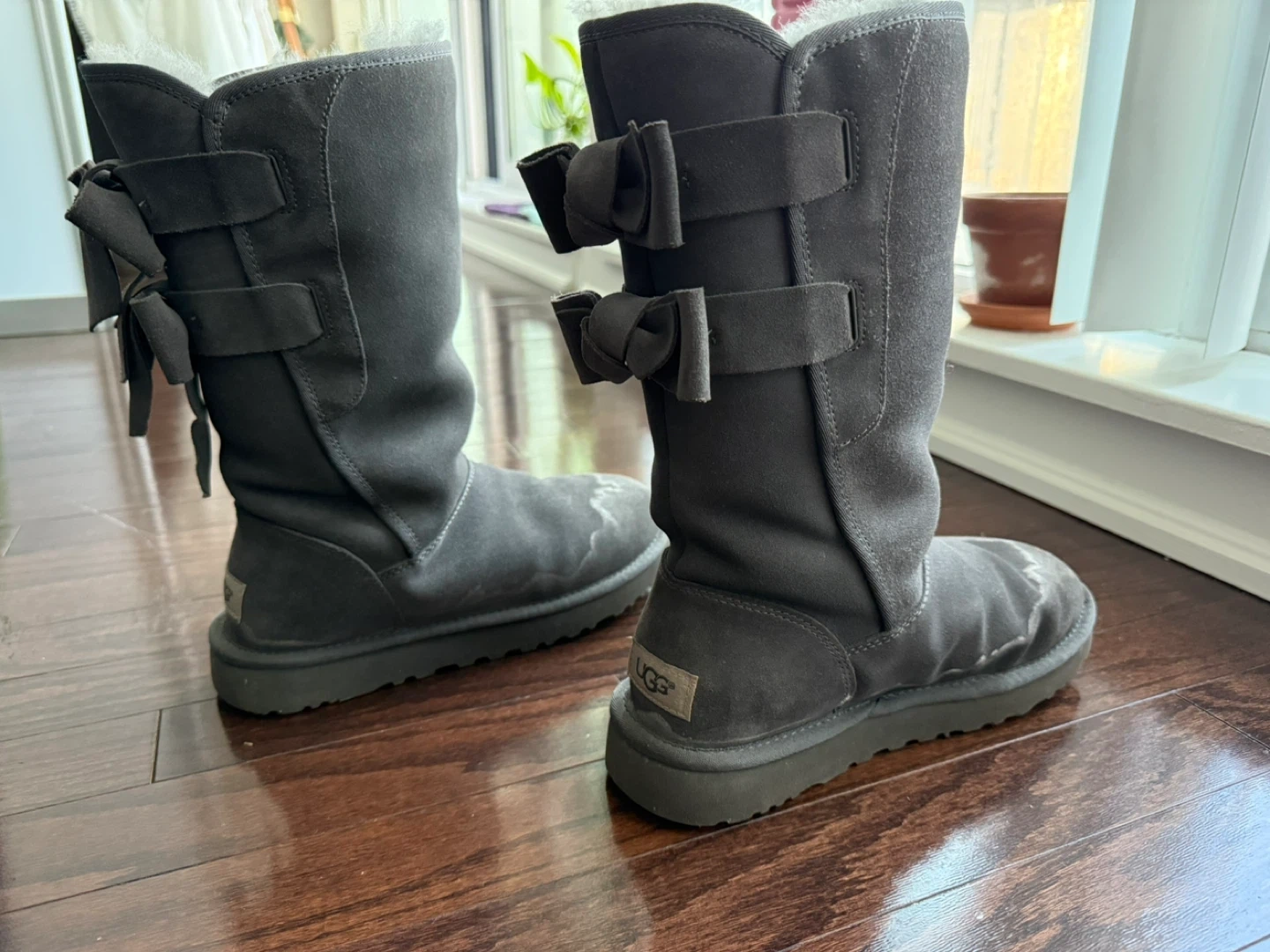 Selling a pair of UGG boots in size 7. They're a stylish gray colour and feature cute bows on the back. Perfect for keeping your feet warm and cozy during the colder months! The salt stains are visible in the photos. Otherwise in very good condition with no rips or tears and were minimally worn. Selling cuz slightly too tight for my feet.