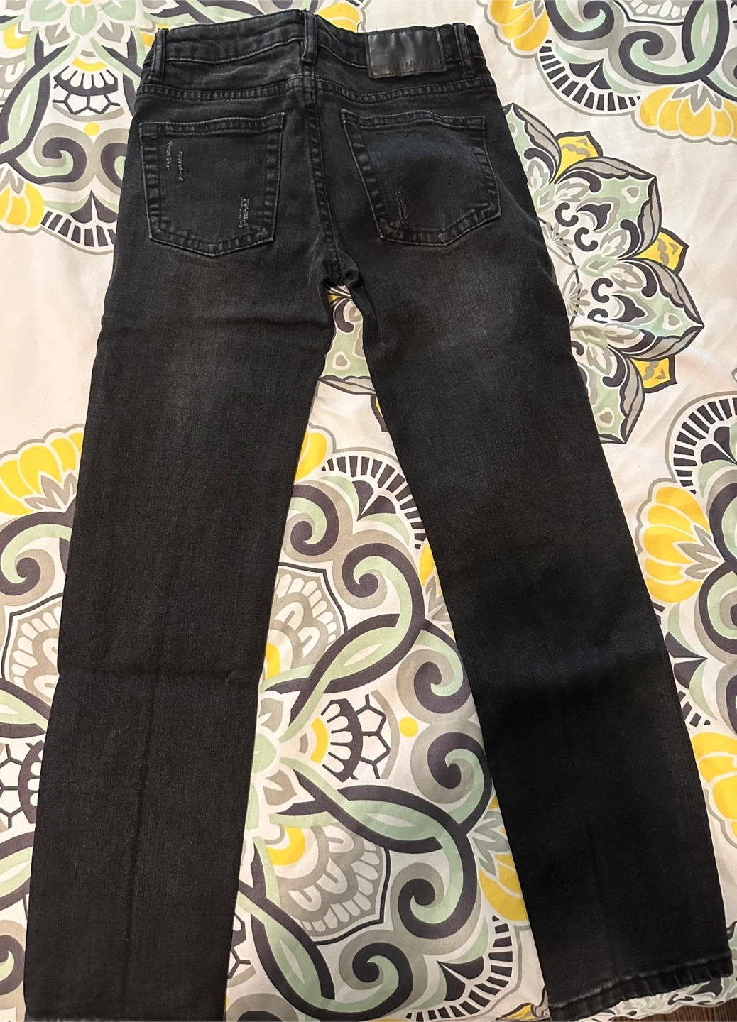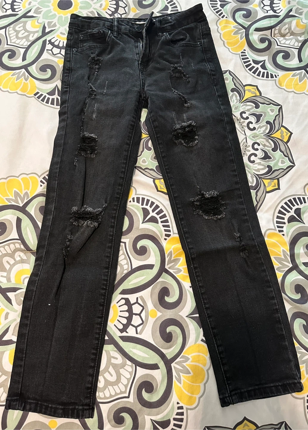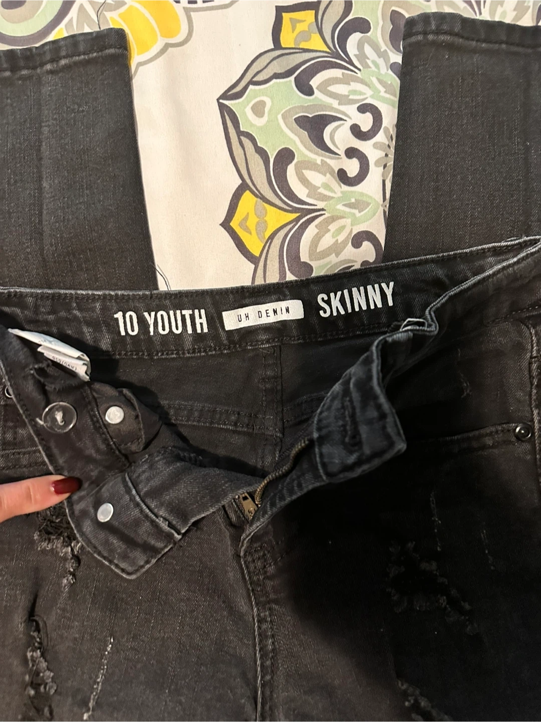 Selling a pair of UH Denim skinny jeans in youth size 10. They're black and have a distressed, ripped look. Great for a trendy kiddo!
