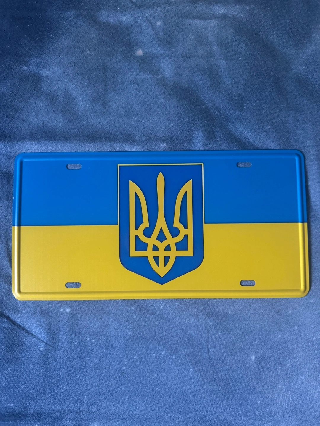 Selling a license plate featuring the Ukrainian flag colours and emblem. It's in great condition and ready to add some flair to your vehicle!
