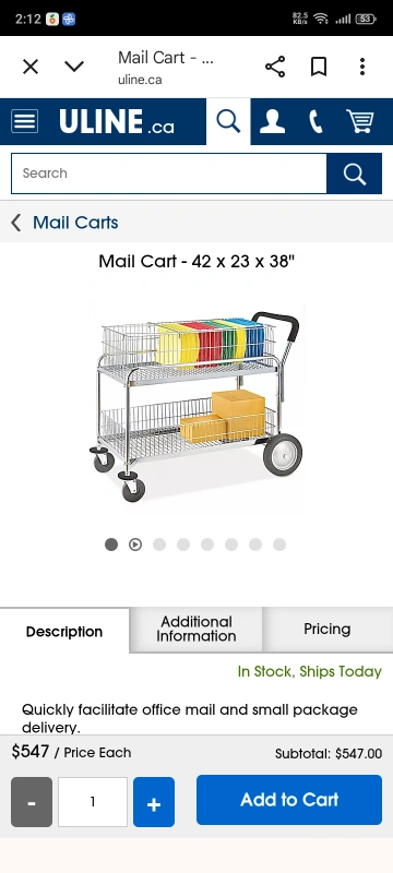 Selling a Uline mail cart that measures 42 x 23 x 38 inches. It's in great shape and ready to help with your office mail and package delivery needs! Originally priced at $547.