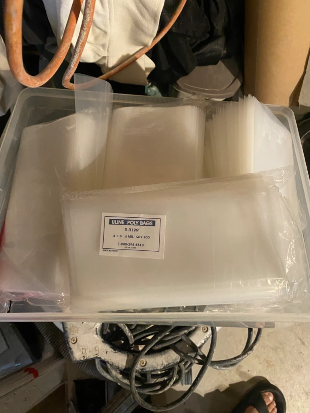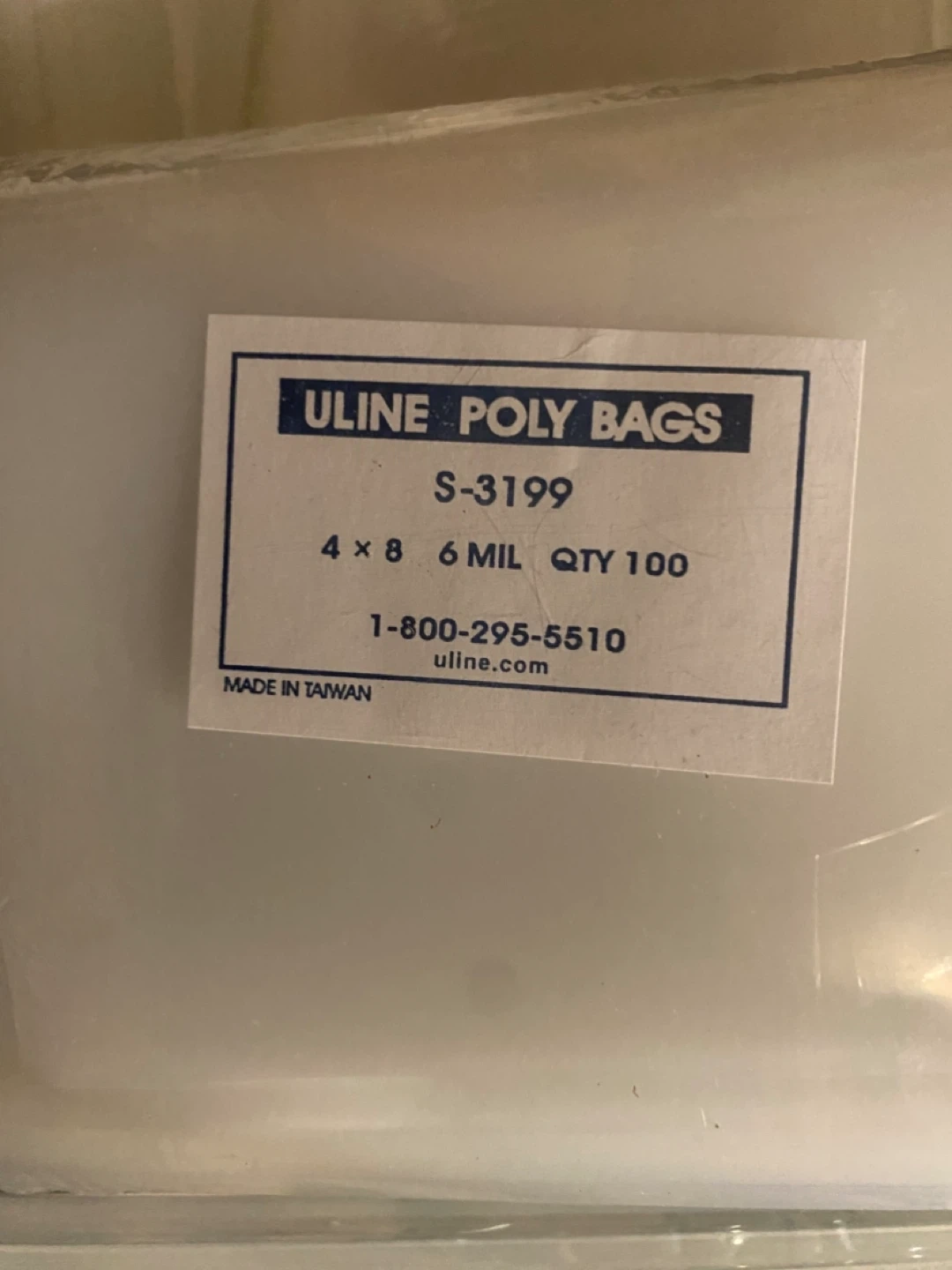 Selling a pack of Uline Poly Bags, model S-3199. These are 4" x 8" and 6 mil thick. There are 100 bags in the quantity. I have 8 packs