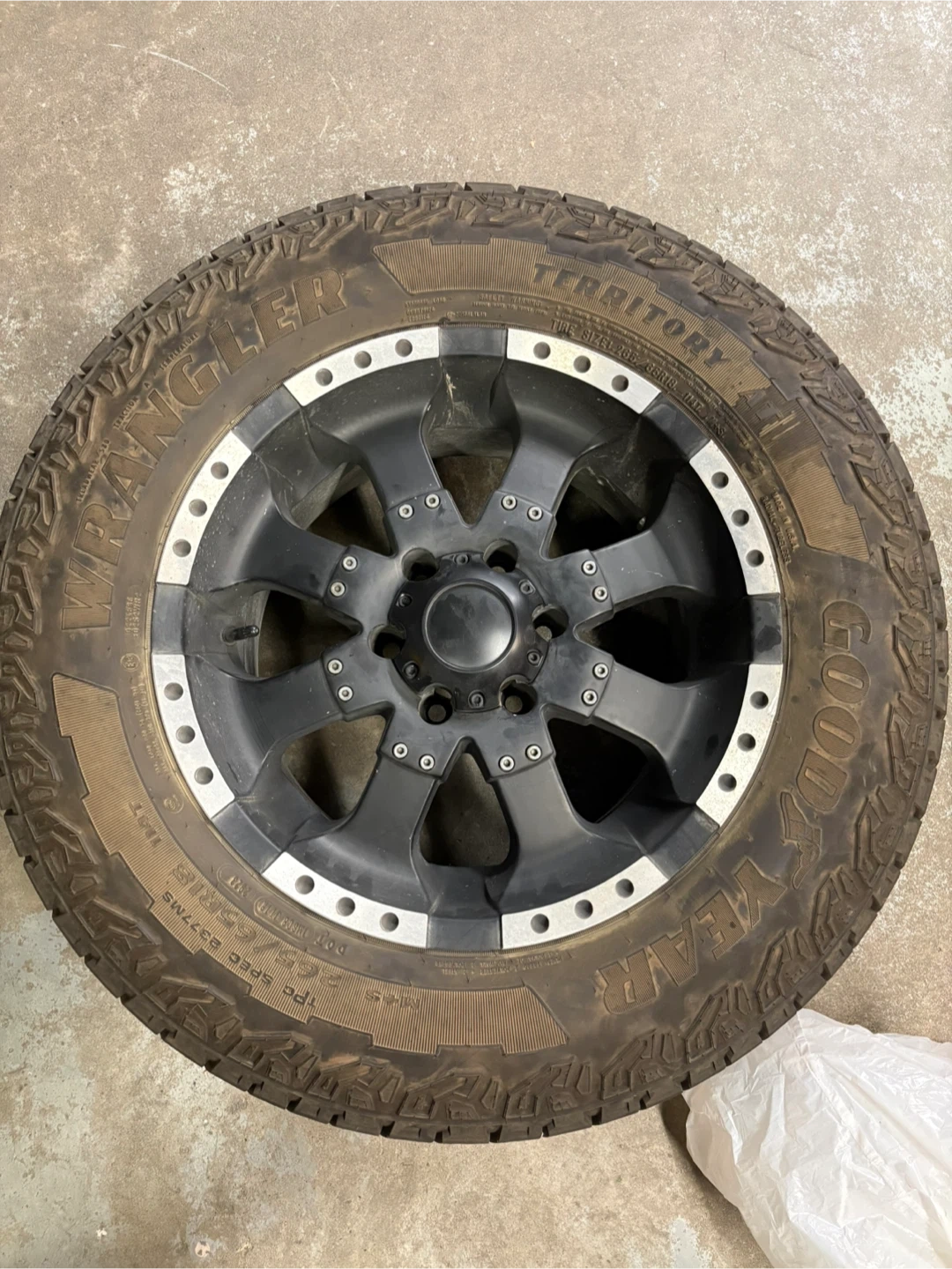 Selling an ultra motorsport wheels with Goodyear Wrangler Territory tire. It comes with Ultra Motorsports chrome center caps and black stealth caps. Great for off-road adventures! 265/65/18. Pulled off FJ cruiser. Will fit 4Runner and other Toyotas