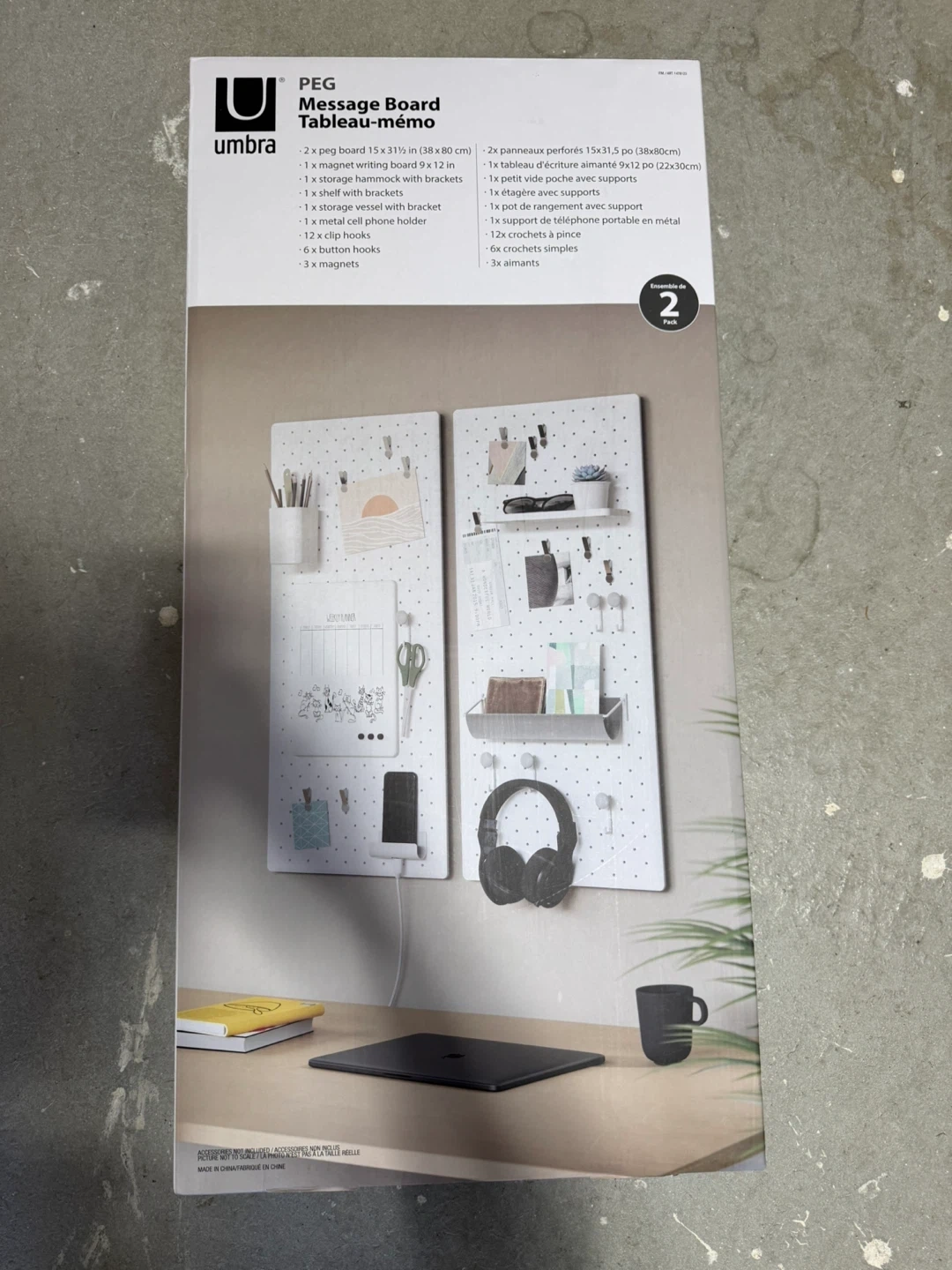 Selling an Umbra PEG Message Board Tableau-mémo. This is a 2-pack and each peg board measures 15 x 31½ inches (38 x 80 cm). It also includes: - 1 x magnet writing board 9 x 12 in - 1 x storage hammock with brackets - 1 x shelf with brackets - 1 x storage vessel with bracket - 1 x metal cell phone holder - 12 x clip hooks - 6 x button hooks - 3 x magnets