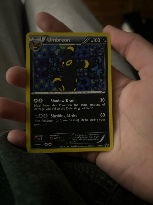 This Umbreon Pokemon card is in good condition and ready to join your collection! It features Shadow Drain and Slashing Strike. This card has been kept safely in a binder. * HP: 100 * Weakness: x2 * Resistance: -20 Looking at similar listings, a fair price for this card is around $50 CAD. If you are reading this, yes, it's still available.