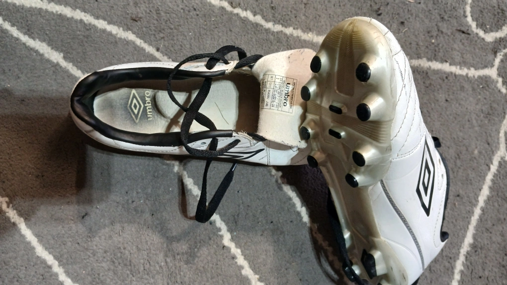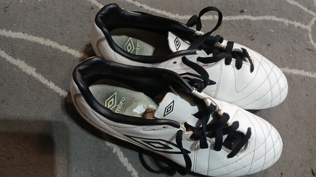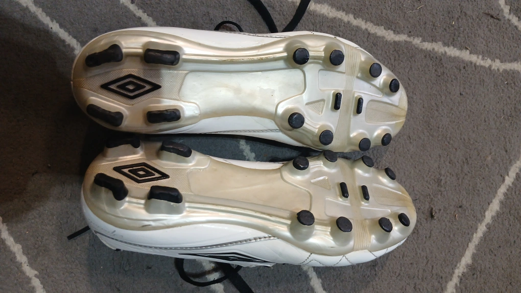 Selling a pair of Umbro soccer cleats US size 3.5. They are white with black accents. They show some signs of wear, but still have lots of life left!