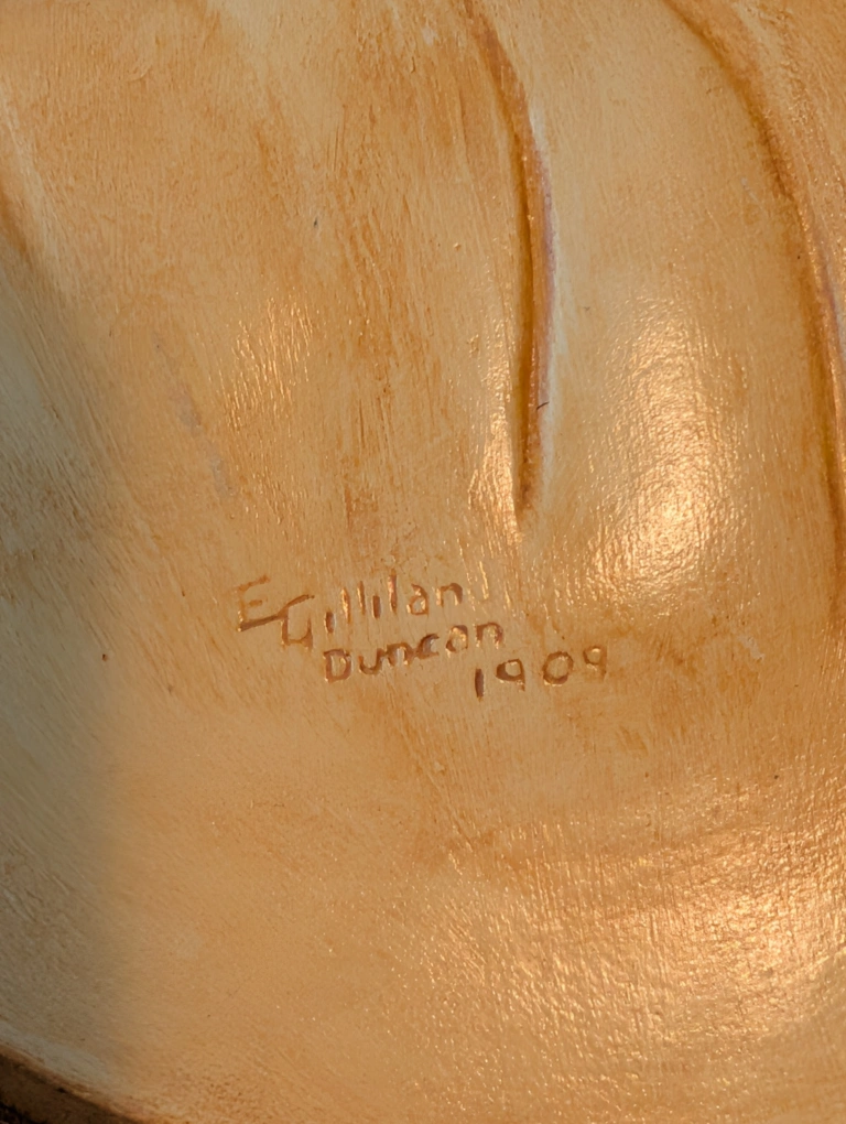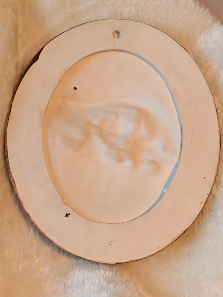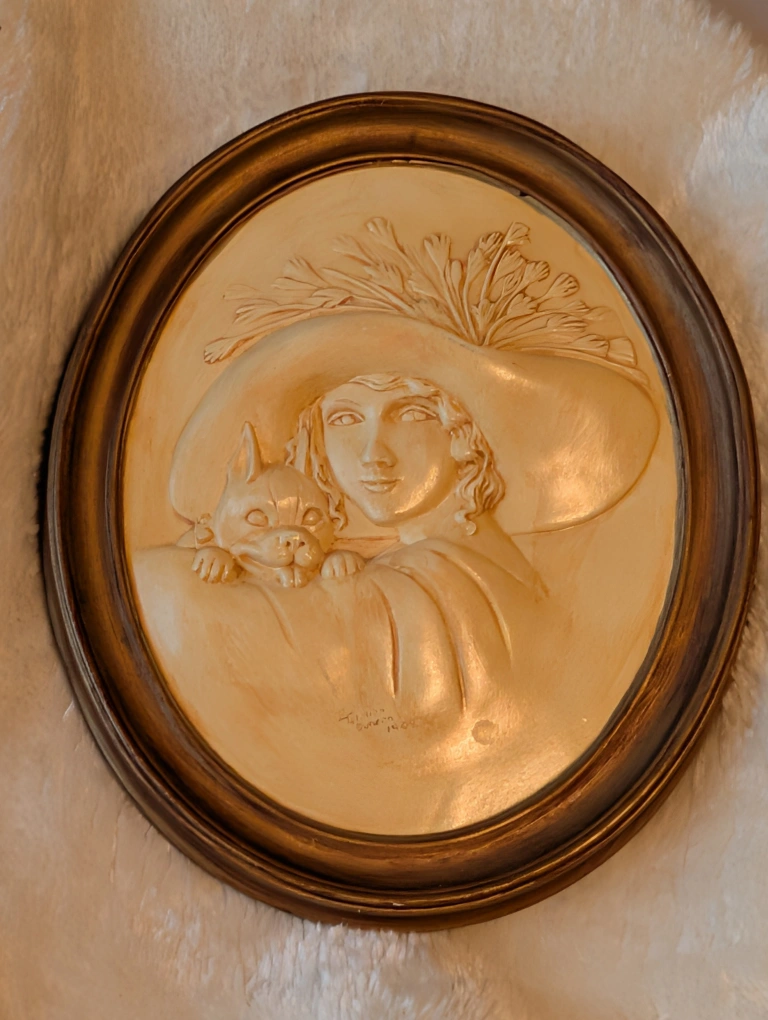 vintage wall plaque created by Erma Gilliland Duncan, based on a 1910 design. These pieces were produced by Duncan Ceramic Products, Inc., in 1975. The specific design features a young woman wearing a large hat and is often accompanied by a dog. The plaques are often referred to as "cameo" or "chalkware" and sometimes have a chalk-like feel.