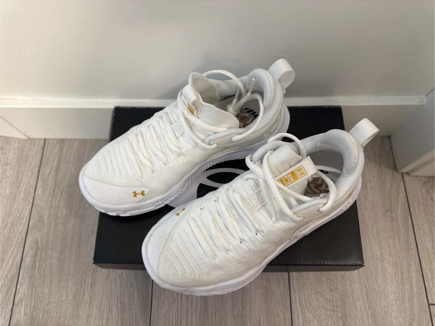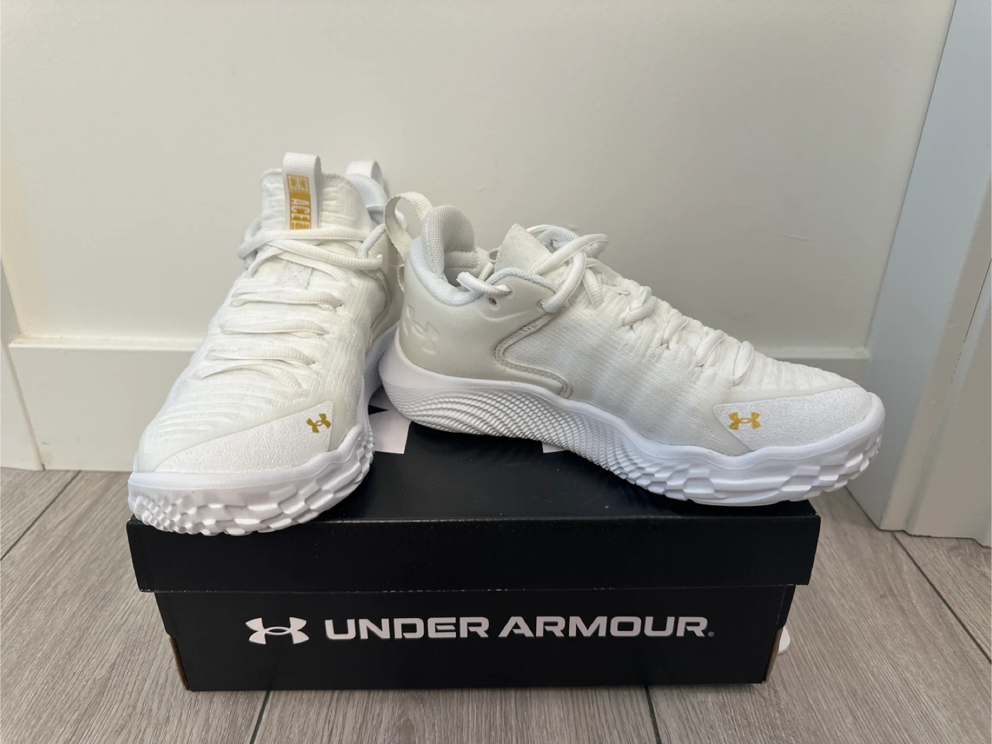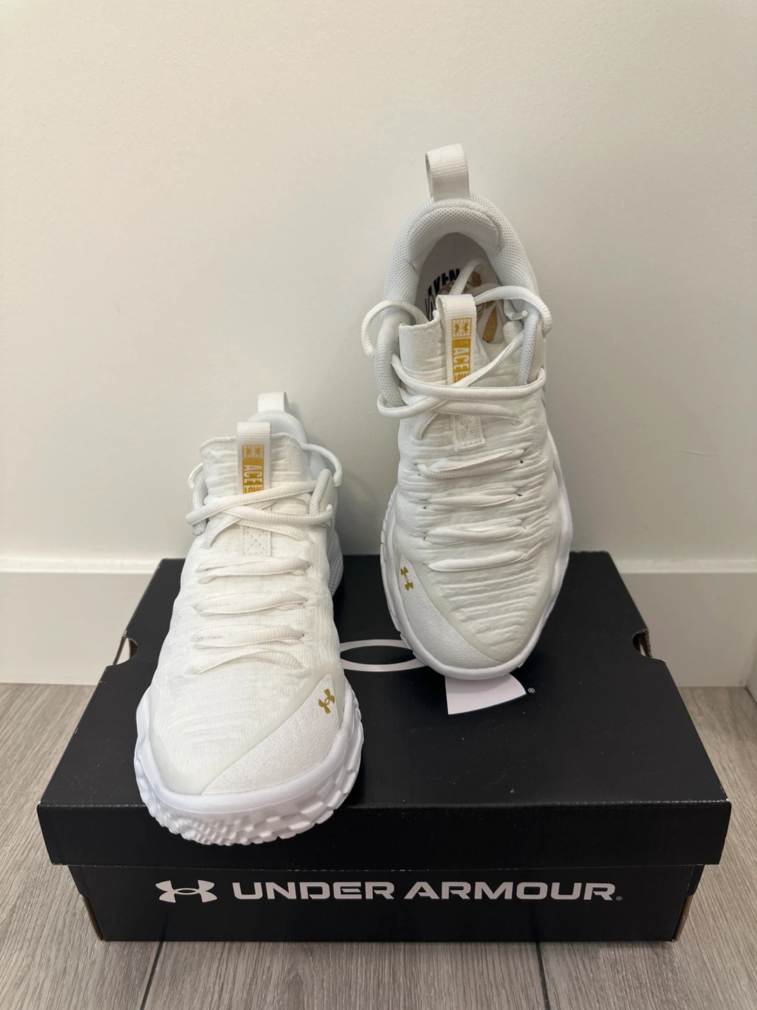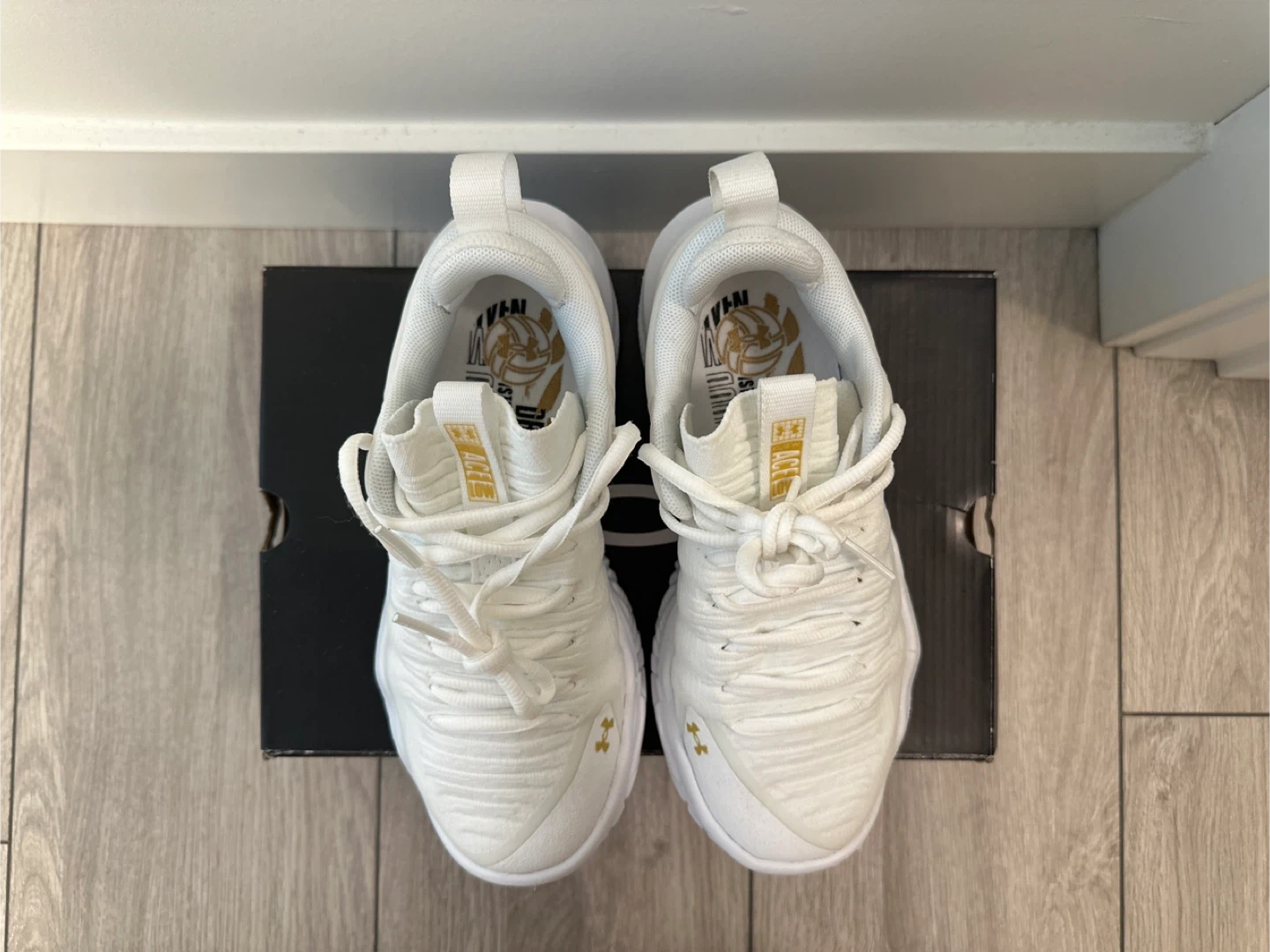 Selling a pair of Under Armour Ace Low Women's Volleyball Shoes in white. ‼️ NEVER BEEN USED ‼️ Size: 5.5 Womens | 3 UK | 36 EUR | 22.5 CM They come with the original box. Great for training, workout, volleyball, or everyday wear! Selling due to buying the wrong size.