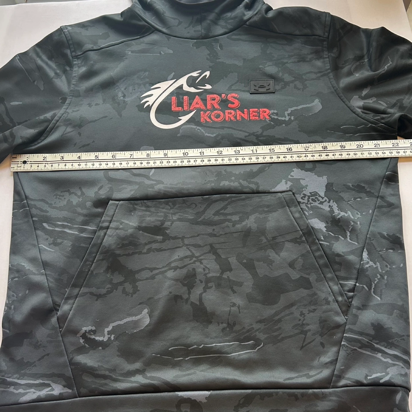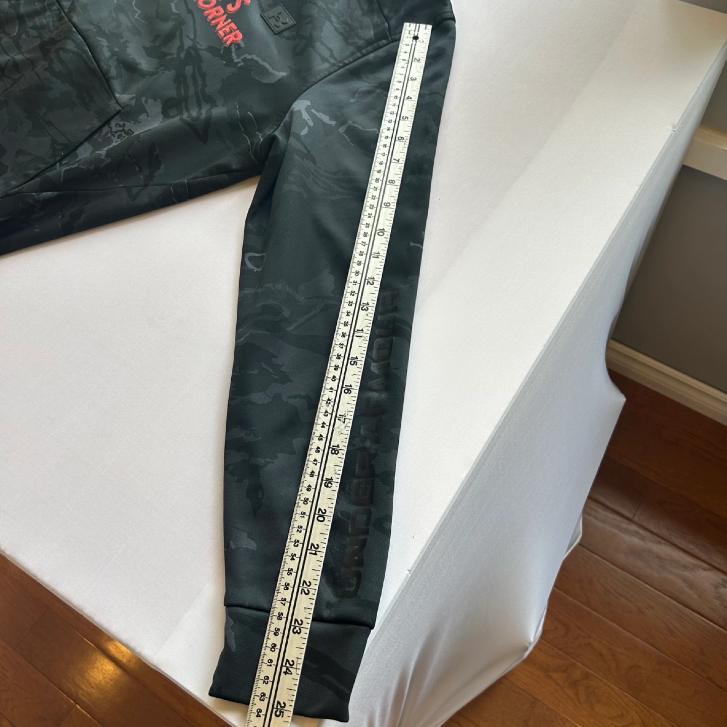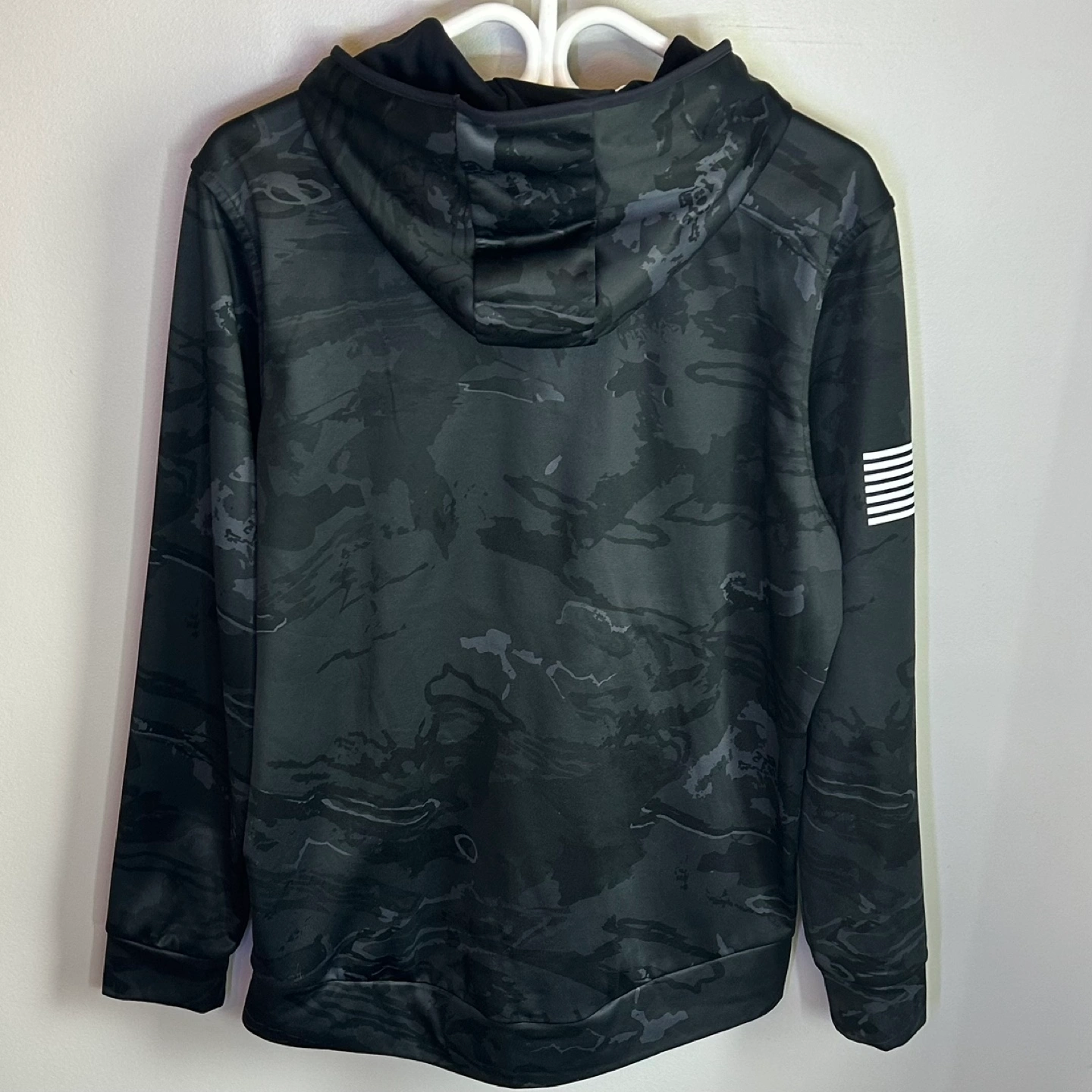 Under Armour black and grey camouflage hoodie with a sleek wind resistant design. Perfect for casual wear. Purchased at Liar’s Korner in Mesa, Arizona in 2024. Brand: Under Armour Color: Grey/Black Camo with White/Red printing Print: Camo Material: Polyester Condition: Excellent Used Condition Size: M Unisex See photos for measurements. Flaws: No flaws however the American flag on the sleeve is backwards. Cross posted. Pickup only. Located 2 blocks west of Polo Park. Shipping options available message me for details.
