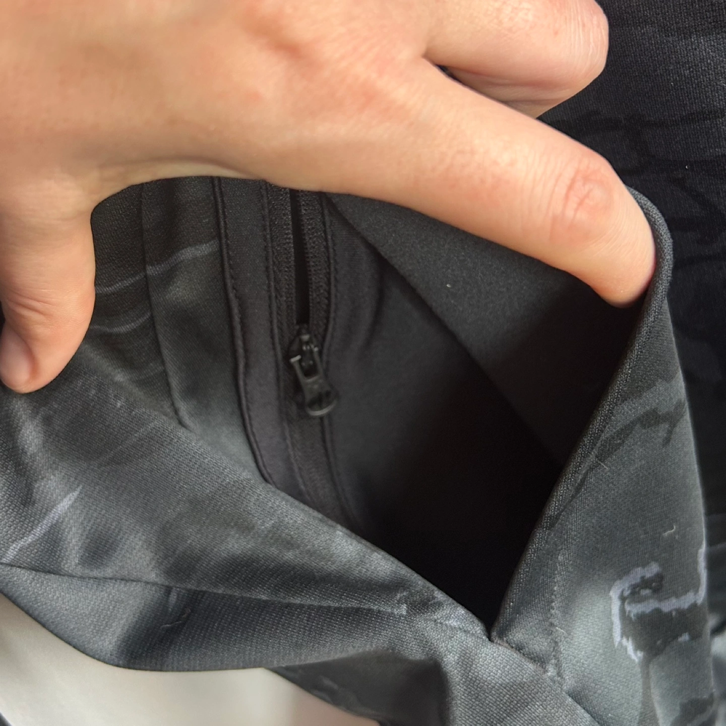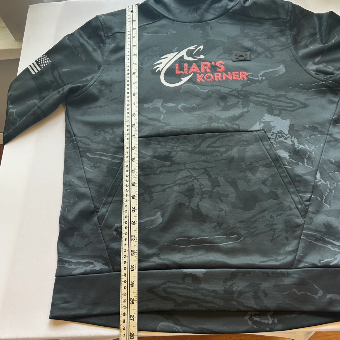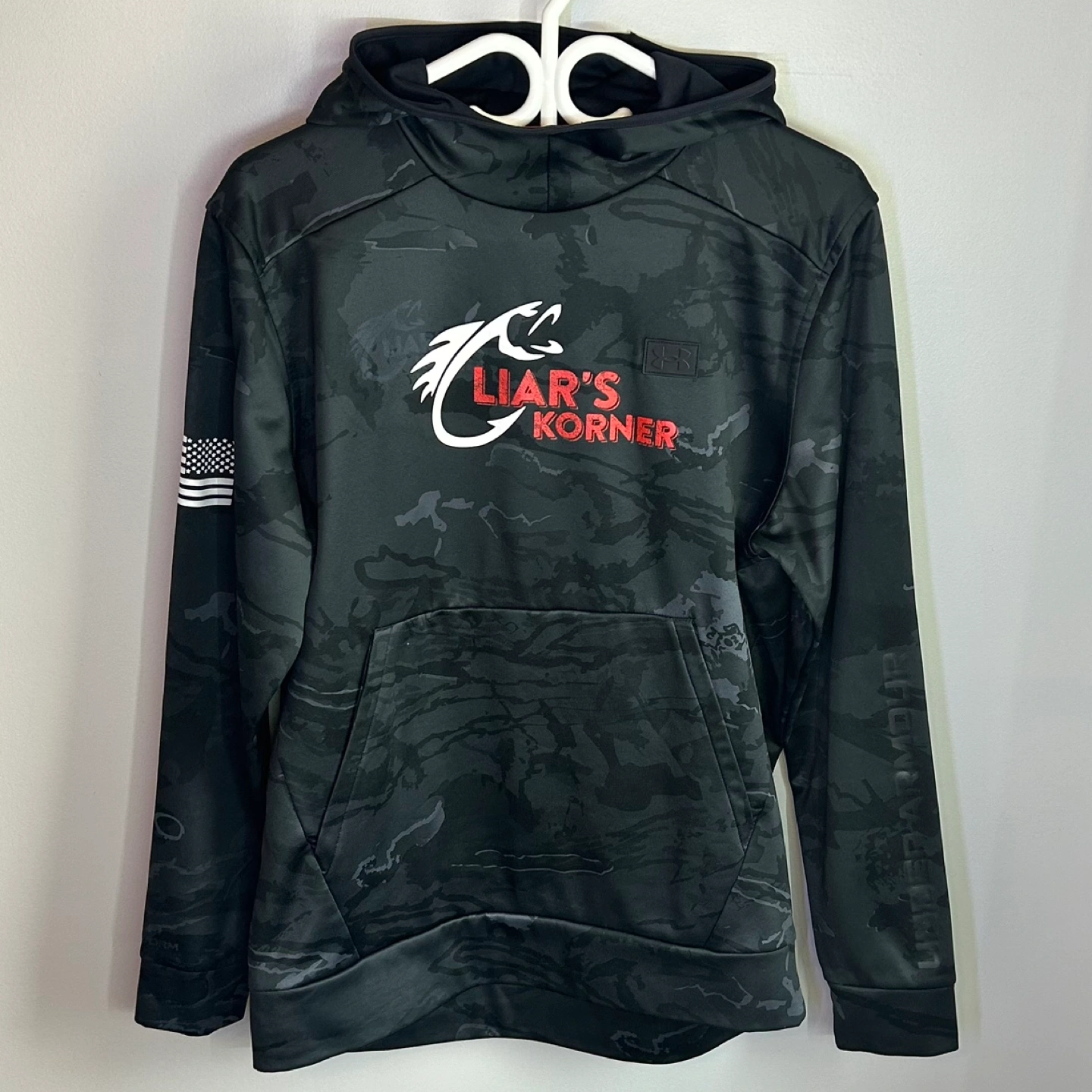 Under Armour black and grey camouflage hoodie with a sleek wind resistant design. Perfect for casual wear. Purchased at Liar’s Korner in Mesa, Arizona in 2024. Brand: Under Armour Color: Grey/Black Camo with White/Red printing Print: Camo Material: Polyester Condition: Excellent Used Condition Size: M Unisex See photos for measurements. Flaws: No flaws however the American flag on the sleeve is backwards. Cross posted. Pickup only. Located 2 blocks west of Polo Park. Shipping options available message me for details.