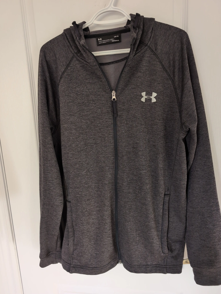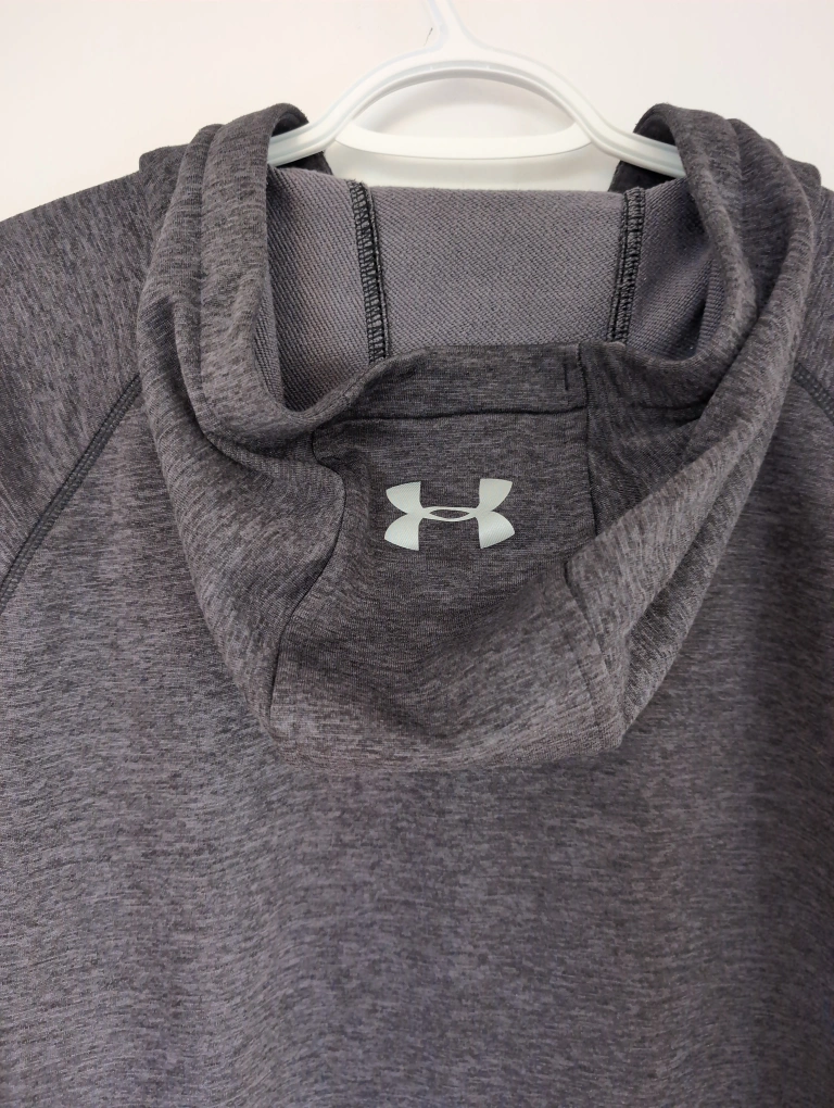 Selling a gently used Under Armour ColdGear fitted hoodie in size large. It's in great shape and perfect for staying warm during outdoor activities. The hoodie features the Under Armour logo on the front and back.