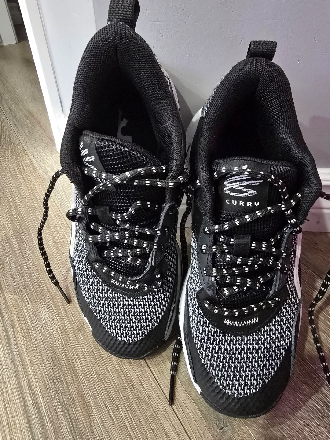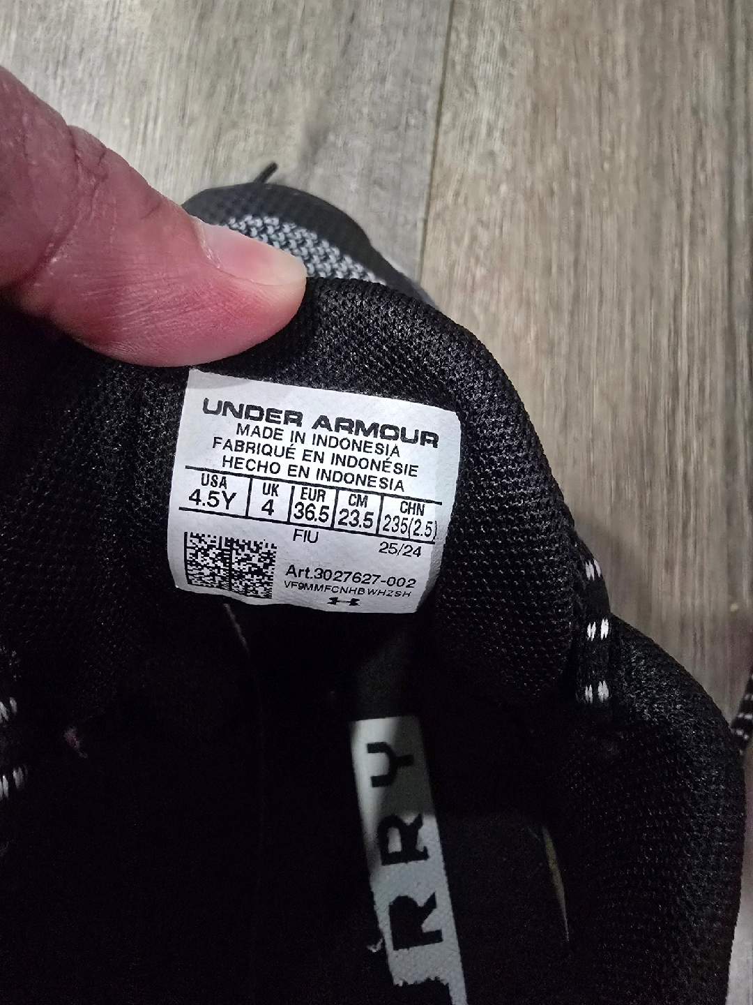 Selling a pair of Under Armour Curry shoes in youth size 4.5Y. They are in great condition and feature a stylish black and white design. Perfect for basketball or everyday wear!