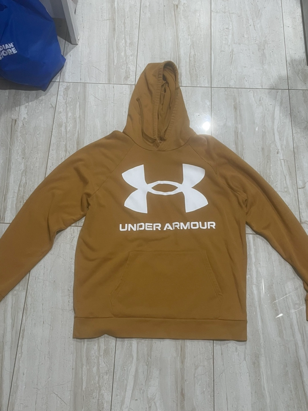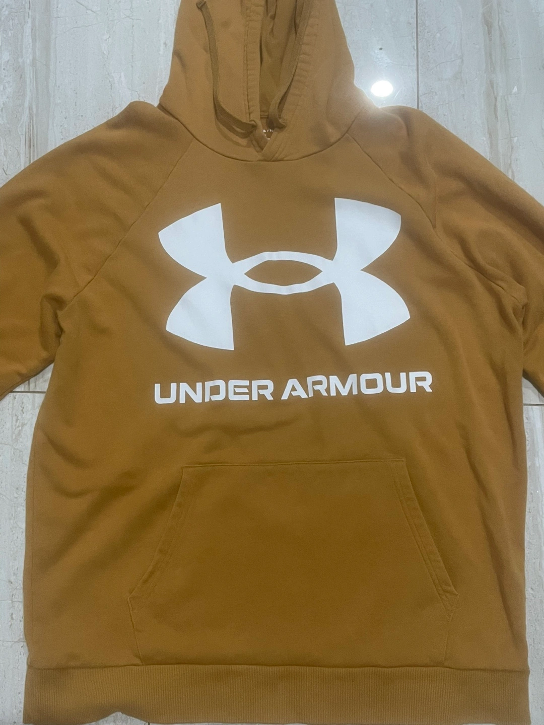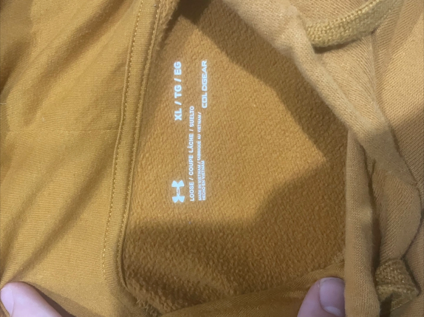 Selling an Under Armour hoodie in size XL. It's in great condition and features the classic Under Armour logo on the front. The colour is a nice mustard yellow, perfect for layering!