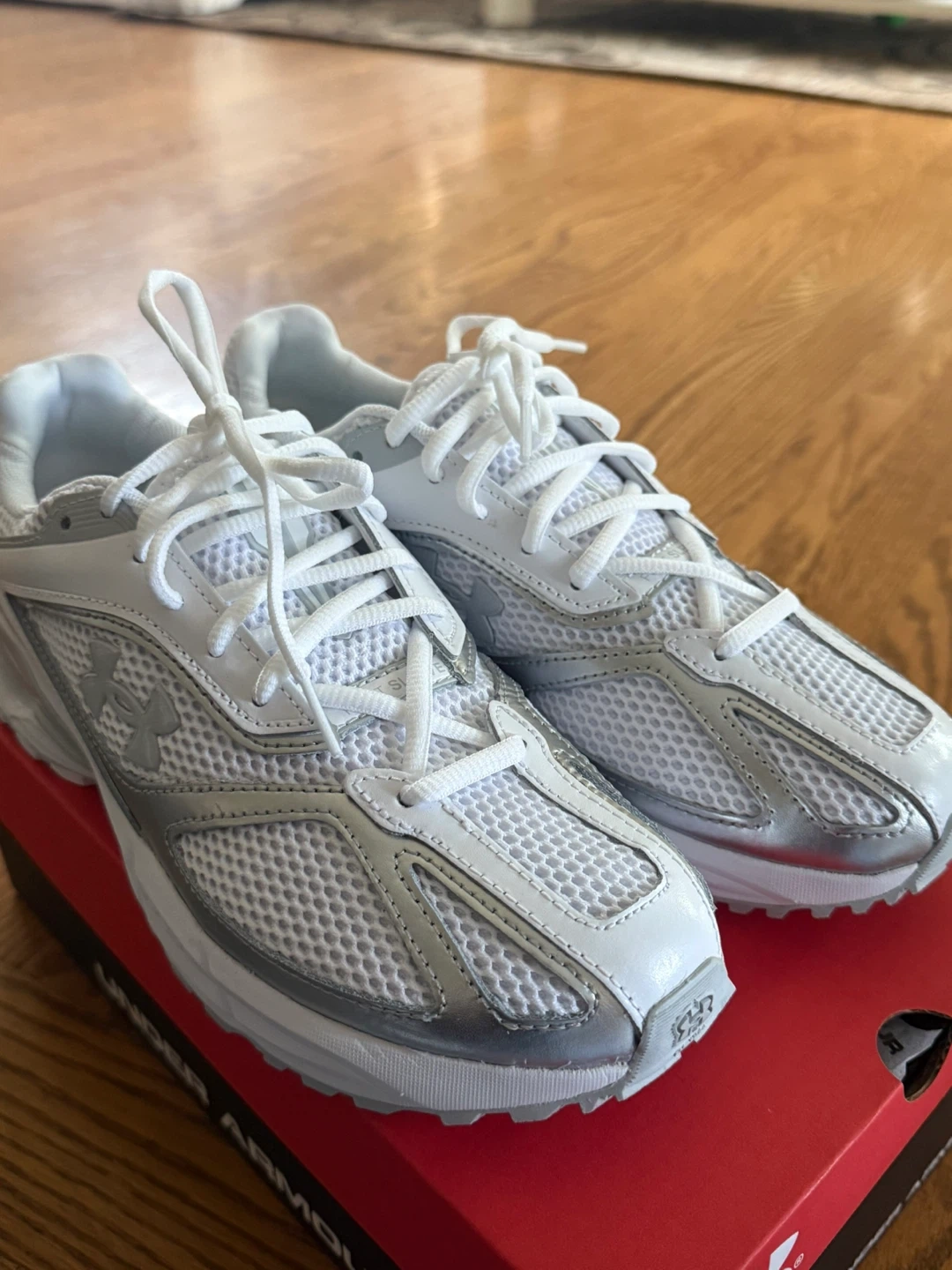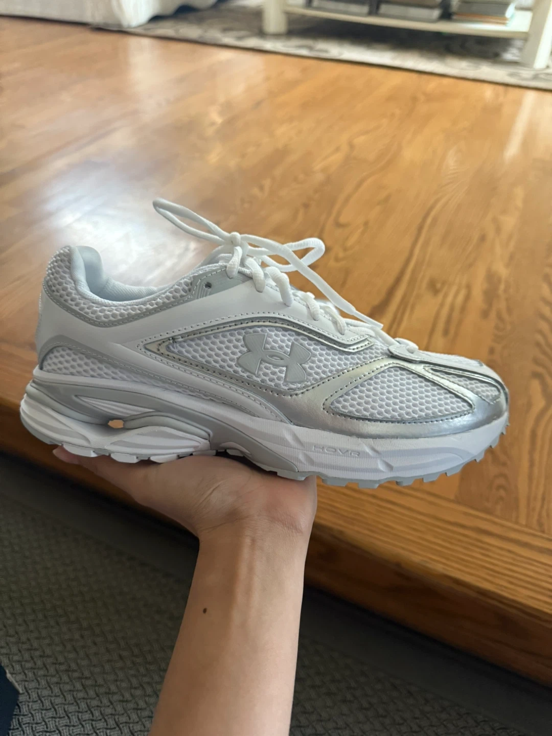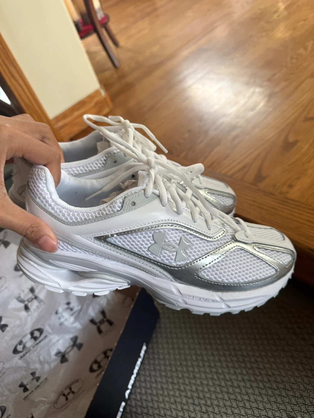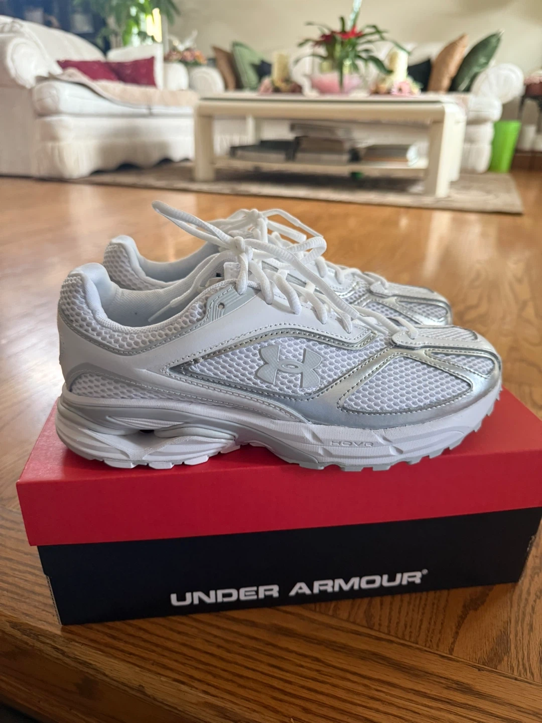 Selling a pair of Under Armour HOVR running shoes in white and silver! DIDN’T USE. They are in great condition and come with the original box. unisex shoes. Perfect for running or everyday wear!