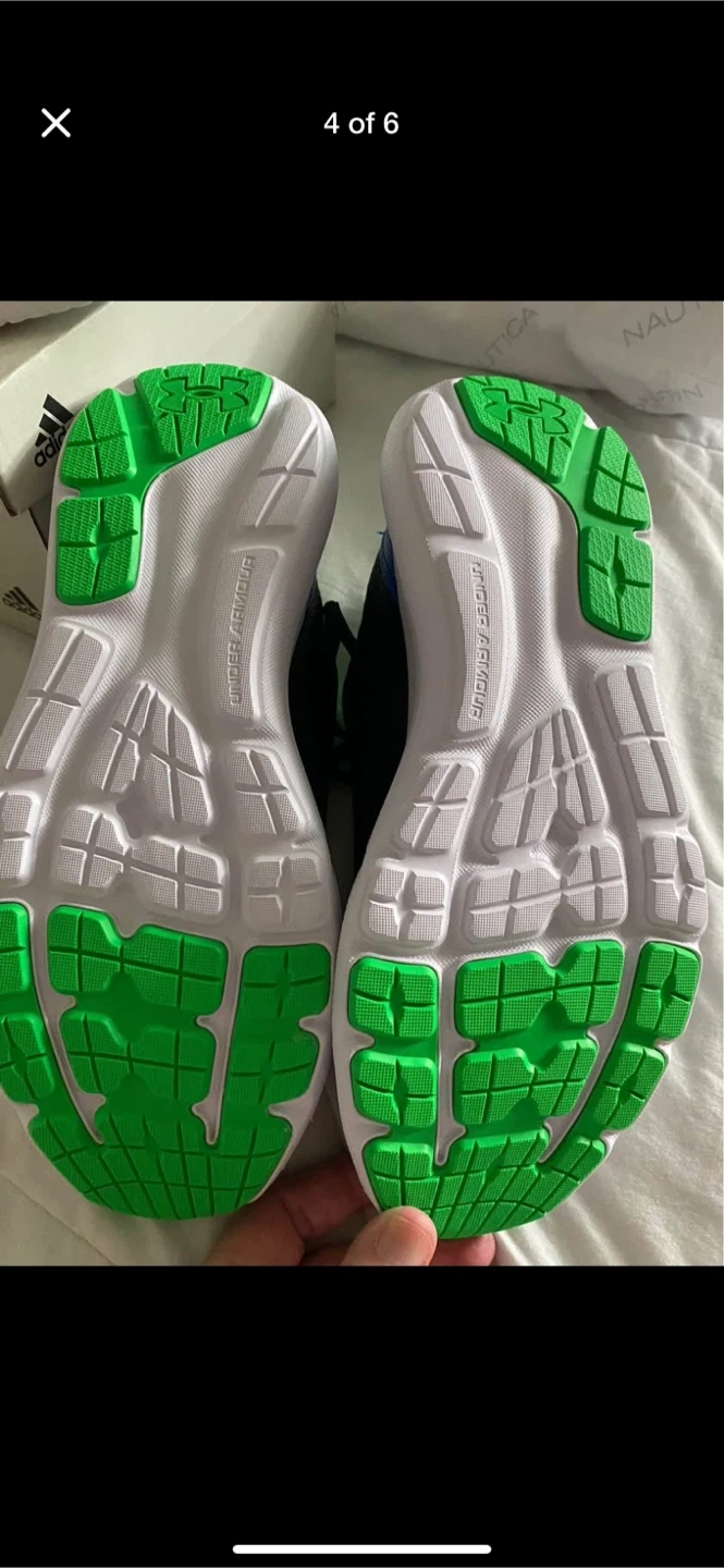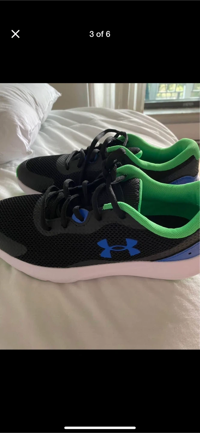 Selling a pair of Under Armour running shoes in black with green accents! They are in great condition and ready for your next run. The soles have a vibrant green colour that adds a pop to the sleek black design