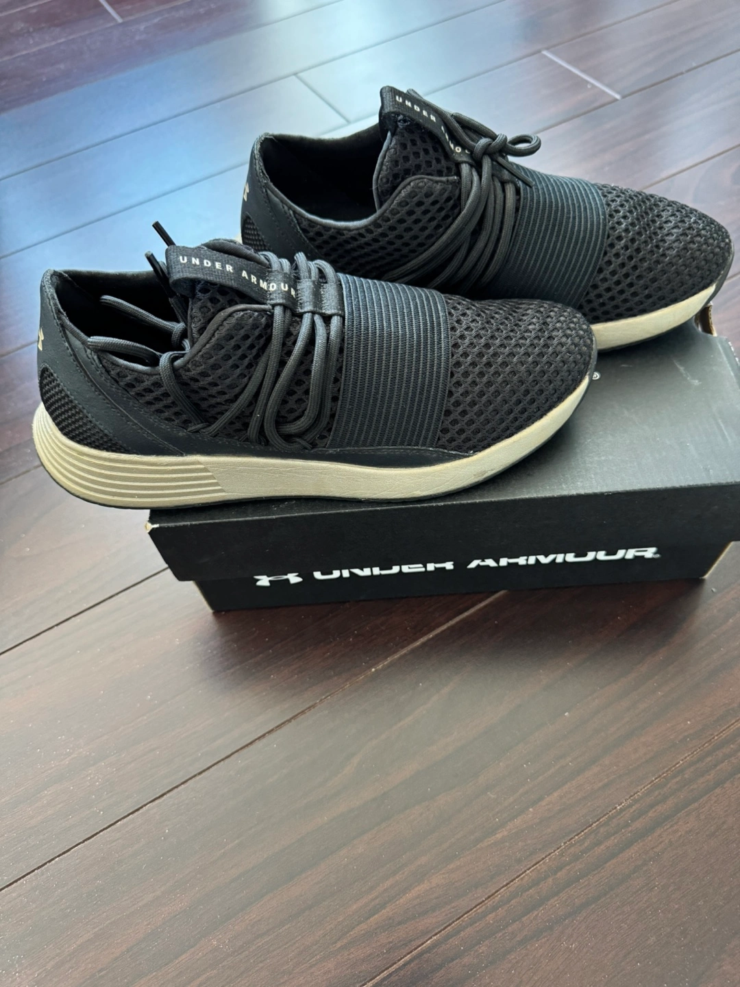 Beautiful Under Armour women's slip-on sneakers. Black mesh upper with gold accents. Minimalist design, comfortable and stylish. This is like new. Come in a box. Pick up at Bathurst/Steeles area.
