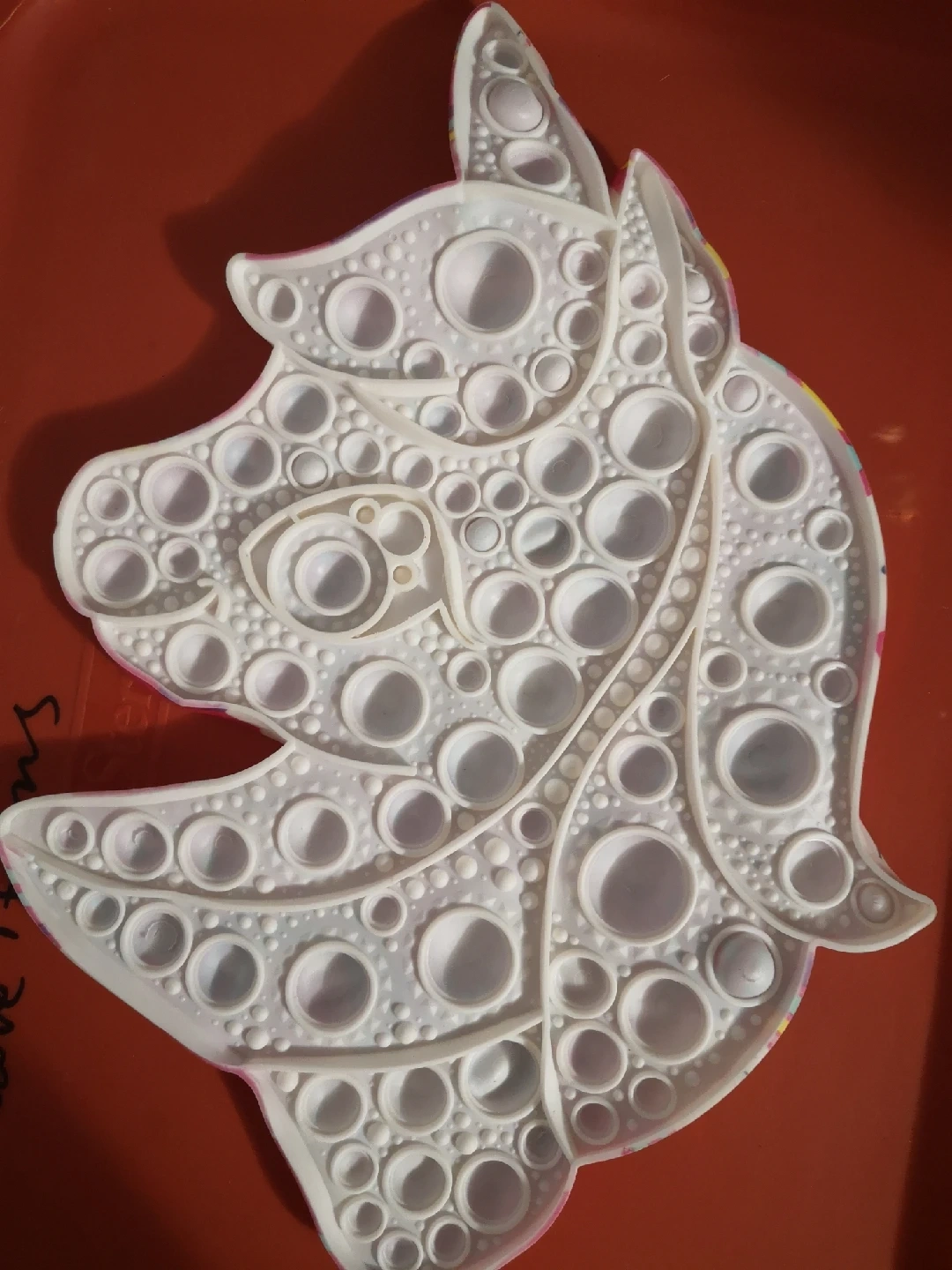 Fun unicorn-shaped pop it fidget toy! Great for stress relief and sensory play. Has a mix of white and pink colours with rainbow accents