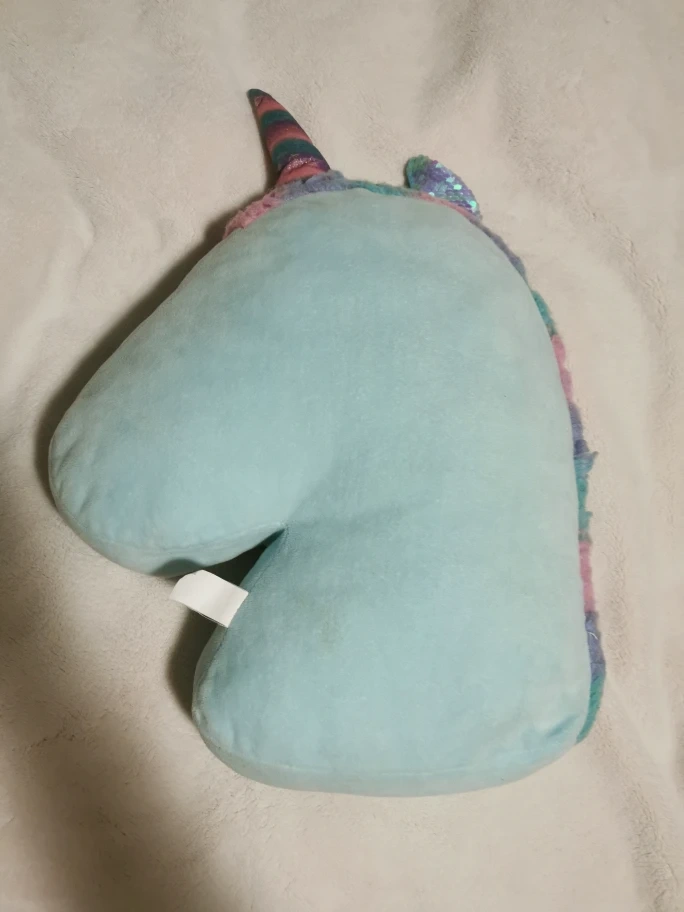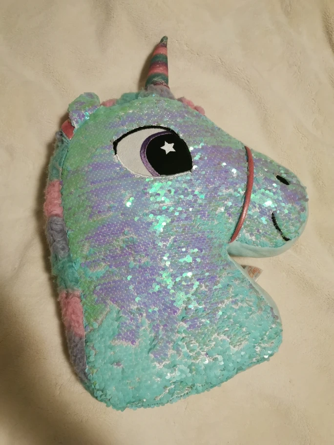 A cute unicorn pillow covered in sequins! It's shaped like a unicorn head and has a soft, plush back. Perfect for adding a touch of magic to any room!