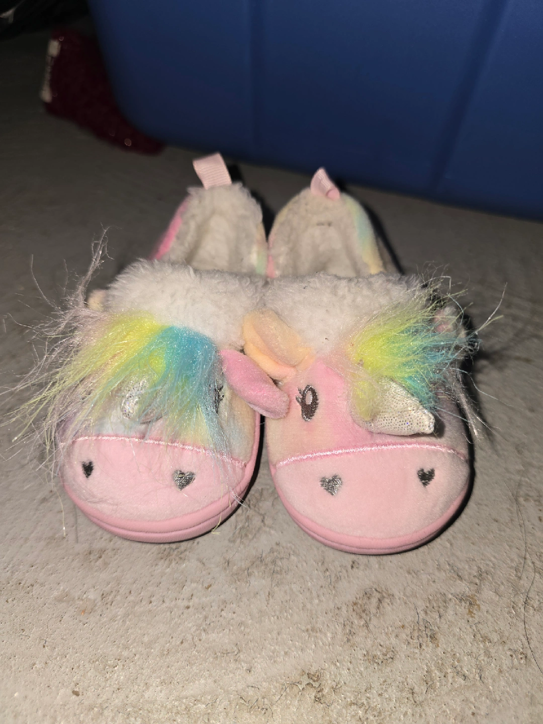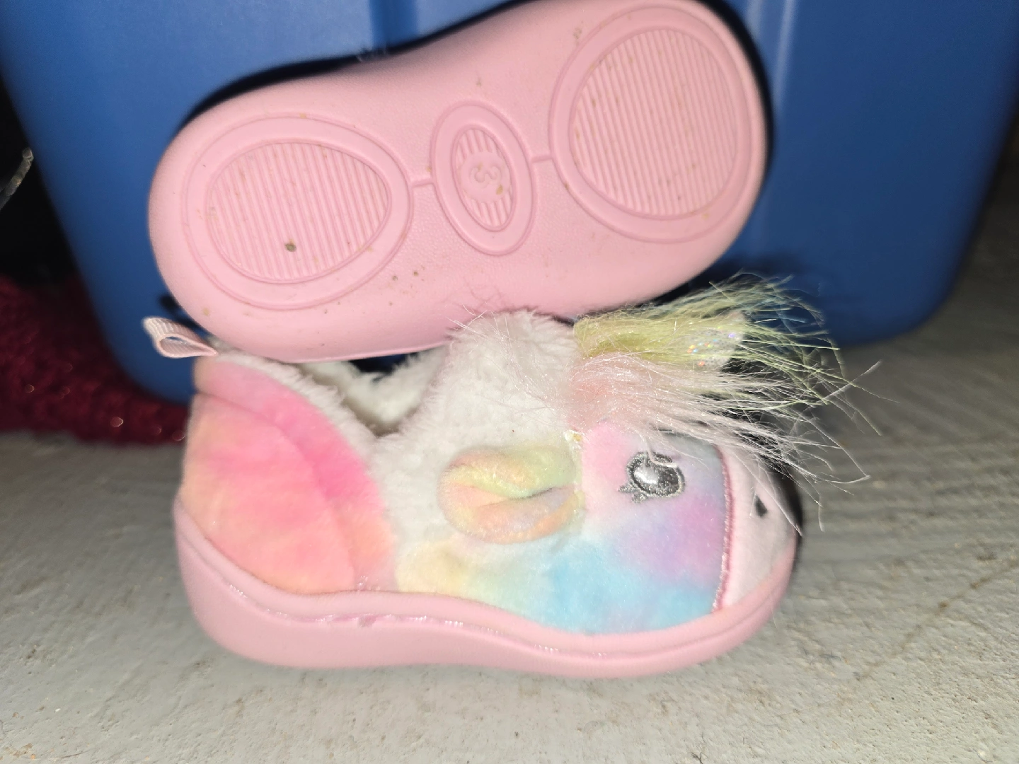 Super cute unicorn slippers in size 2! They're in great condition and ready for a new home. Perfect for keeping little feet warm and cozy