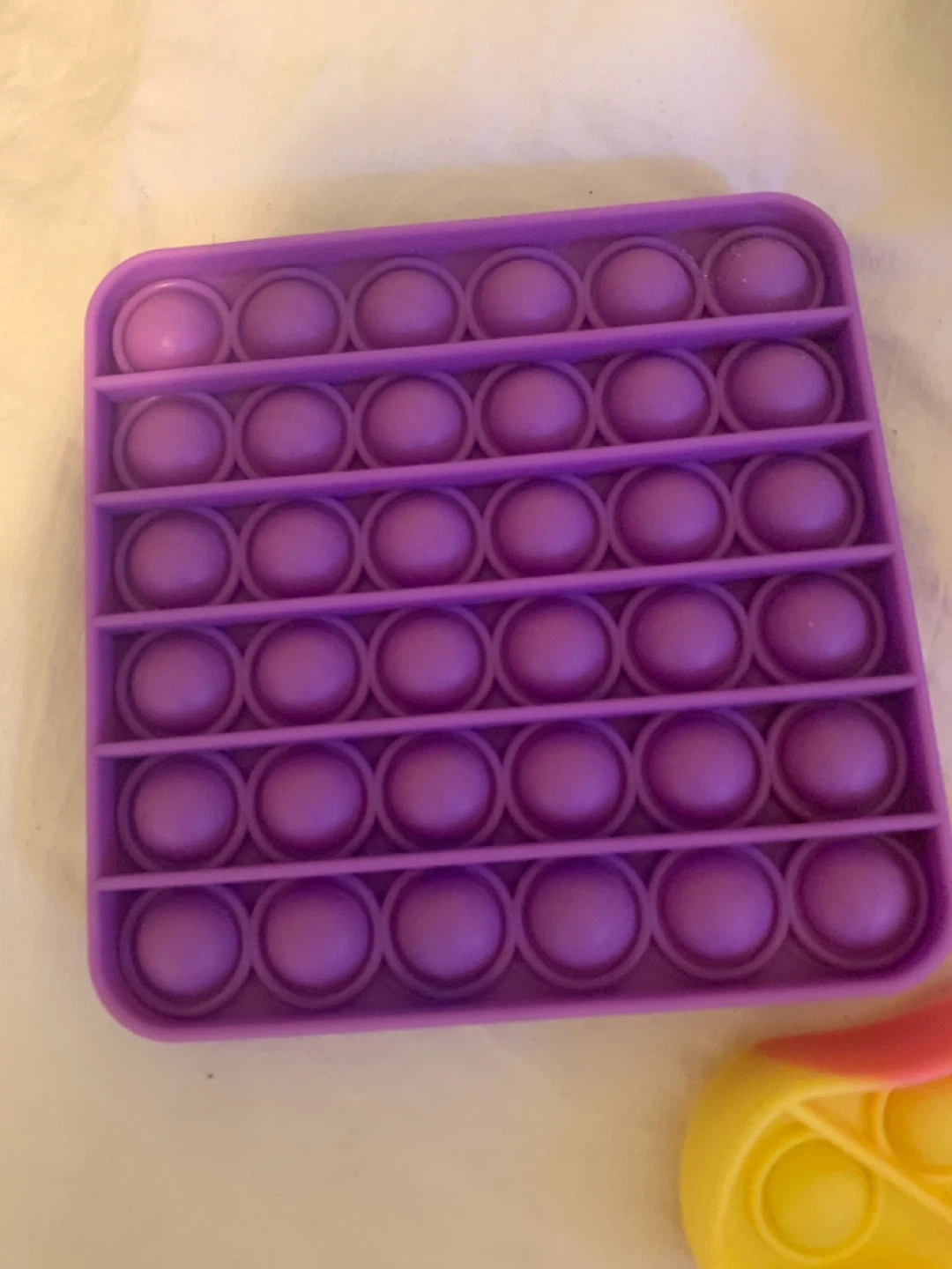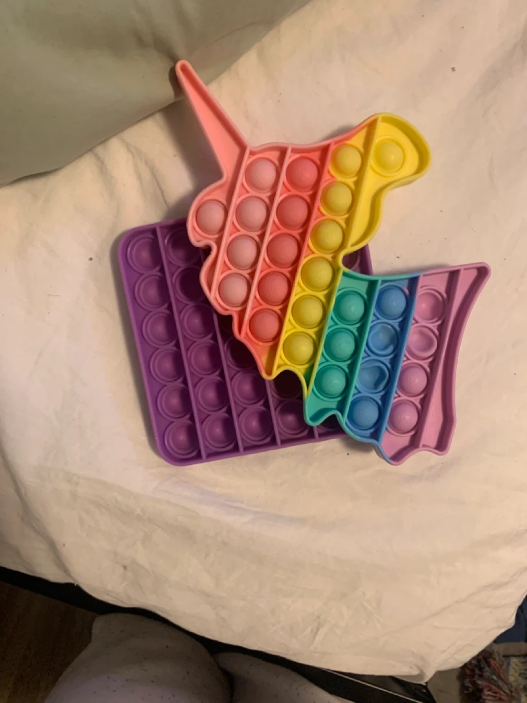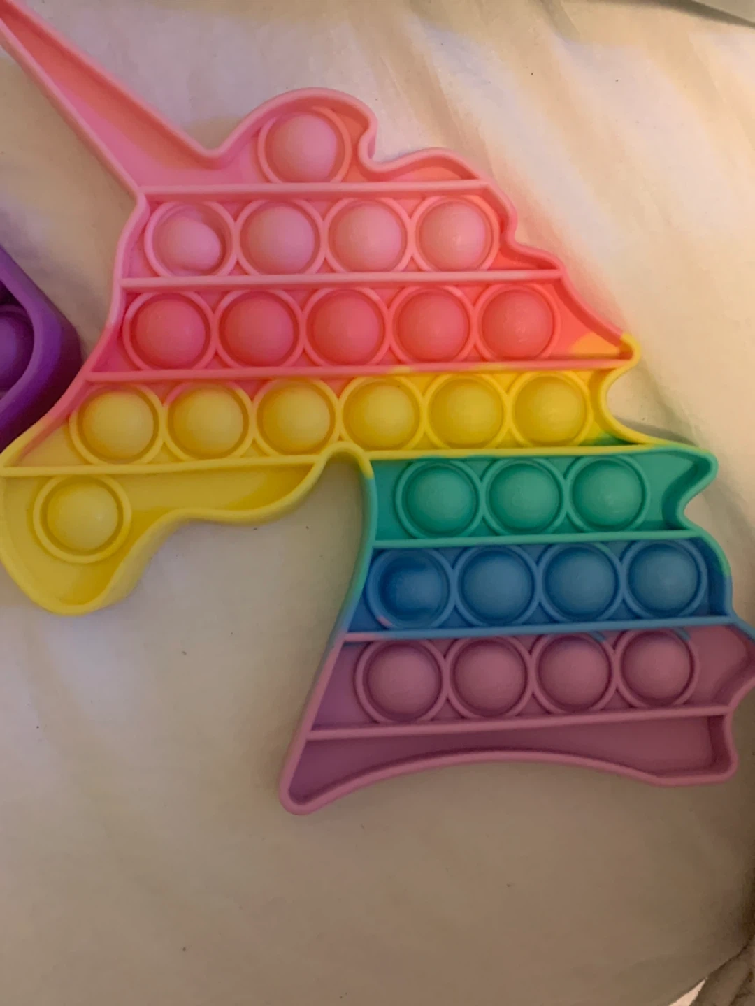 Selling a couple of fun Pop It fidget toys! One is a colourful unicorn shape and the other is a square shape in purple. Great for stress relief and sensory play! Will leave at door CASH ONLY place cash under mat