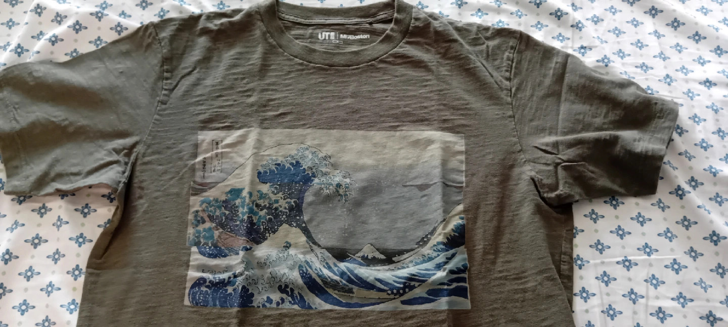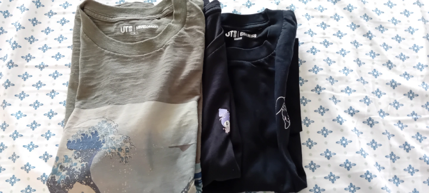 Selling three UT (Uniqlo T-shirt) graphic tees! One is black with a small Kuromi design,one is a light green/grey colour with a Great Wave off Kanagawa print, and one is a OSHI NO KO one! All are in great condition and ready for a new home!!! 10 bucks each :)