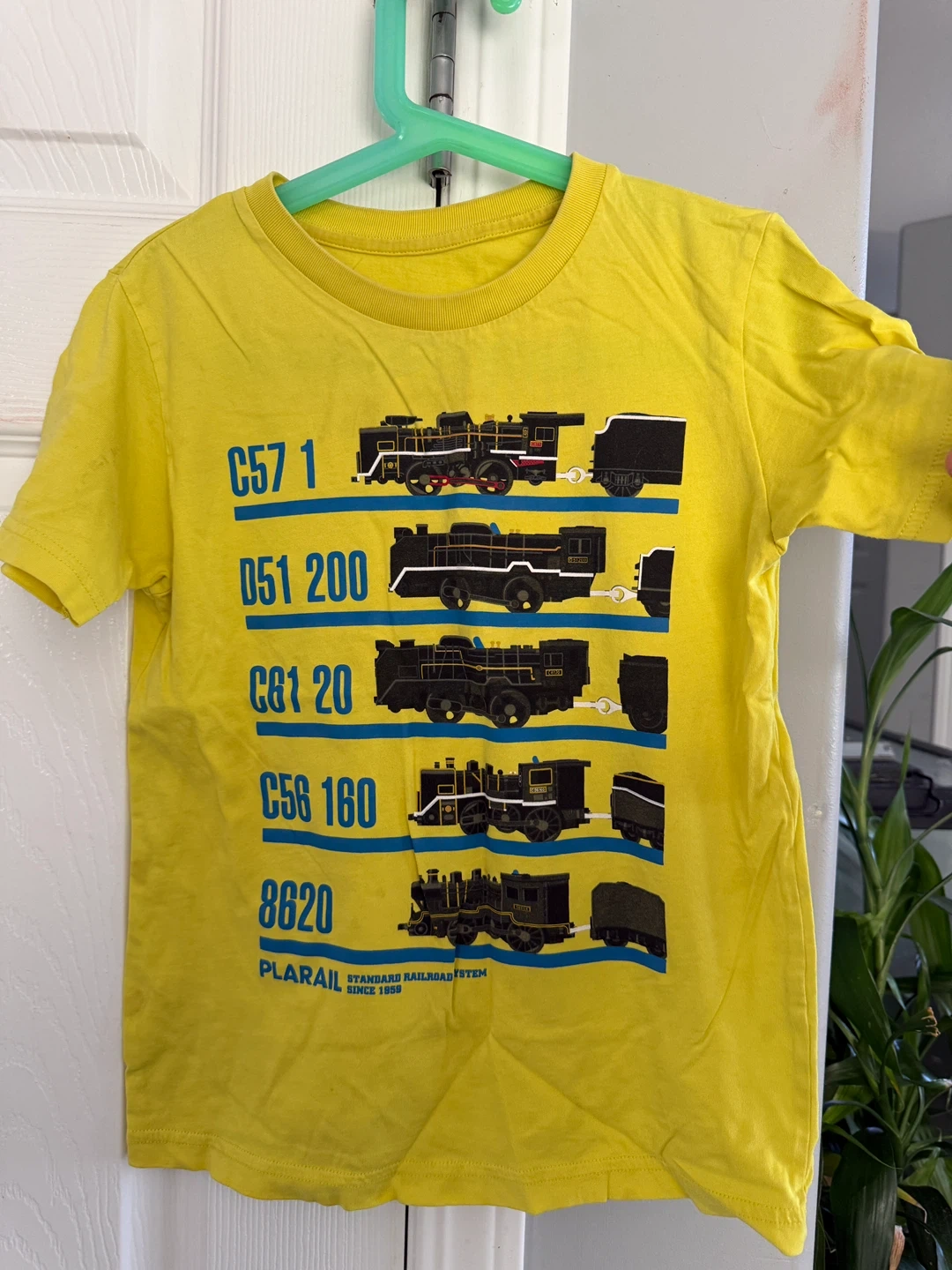 A cute yellow t-shirt with a train design from Plarail! Features different train models and numbers. A fun shirt for any train enthusiast!