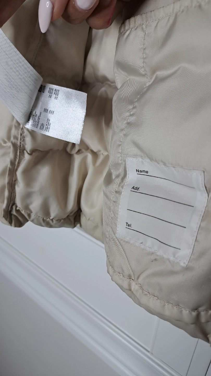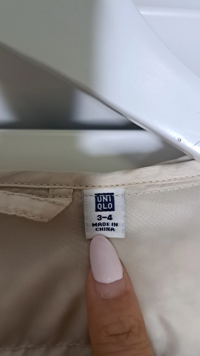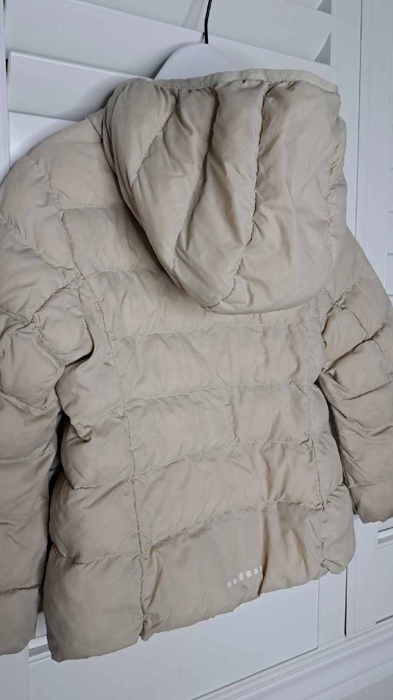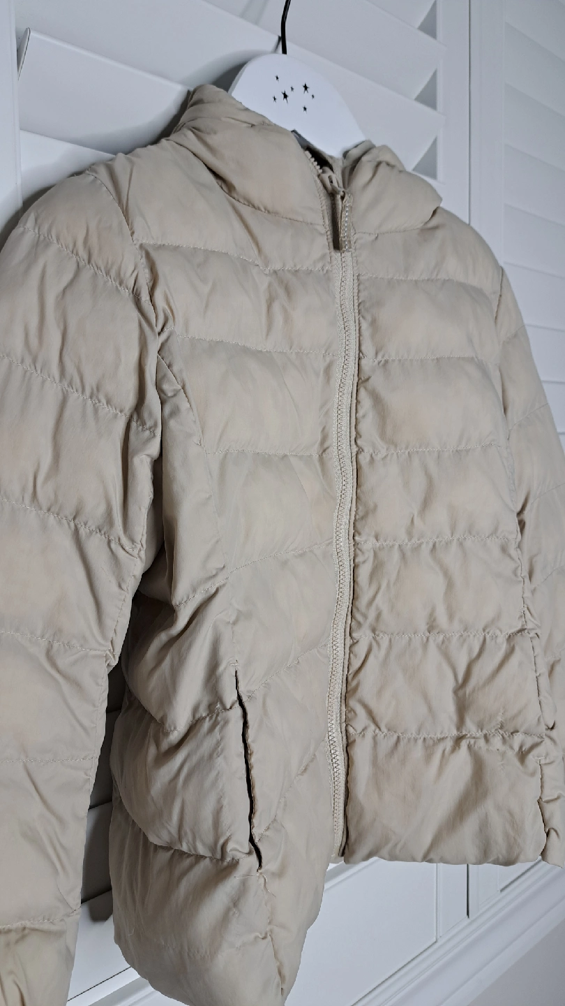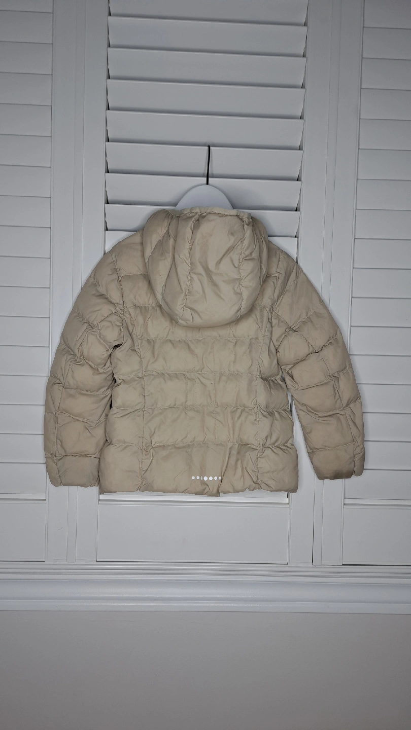 A cute and cozy Uniqlo padded jacket in size 3-4. It's a light beige colour and perfect for keeping your little one warm on chilly days