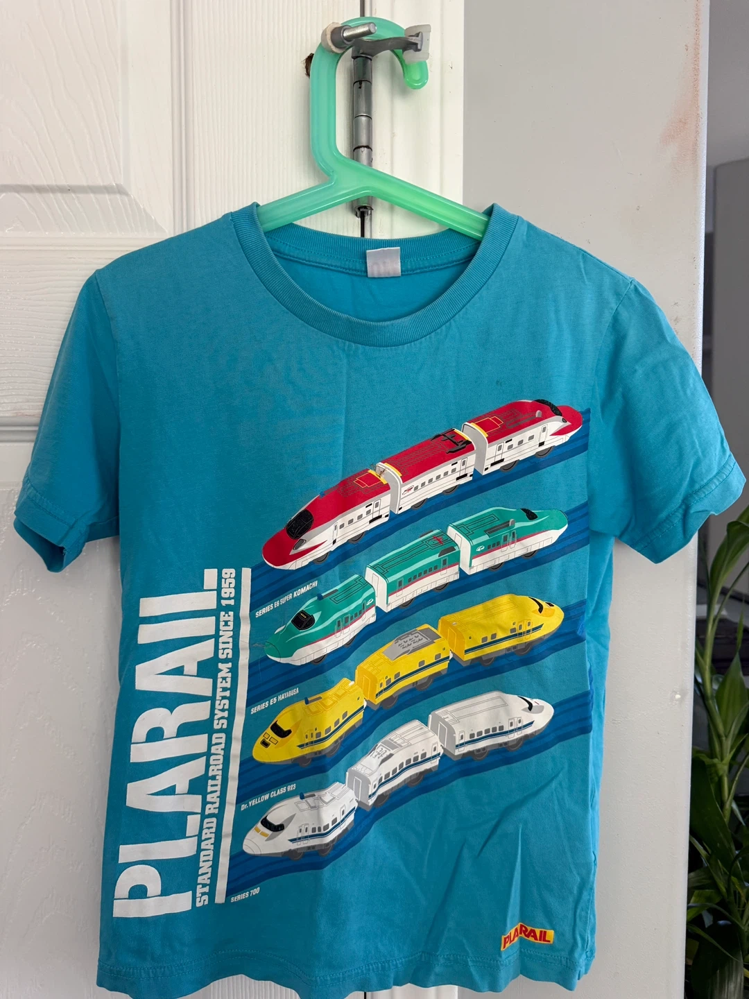 Selling a cute Uniqlo UT kids' T-shirt with a Plarail train design! The size is 130, perfect for kids who love trains and comfortable clothing