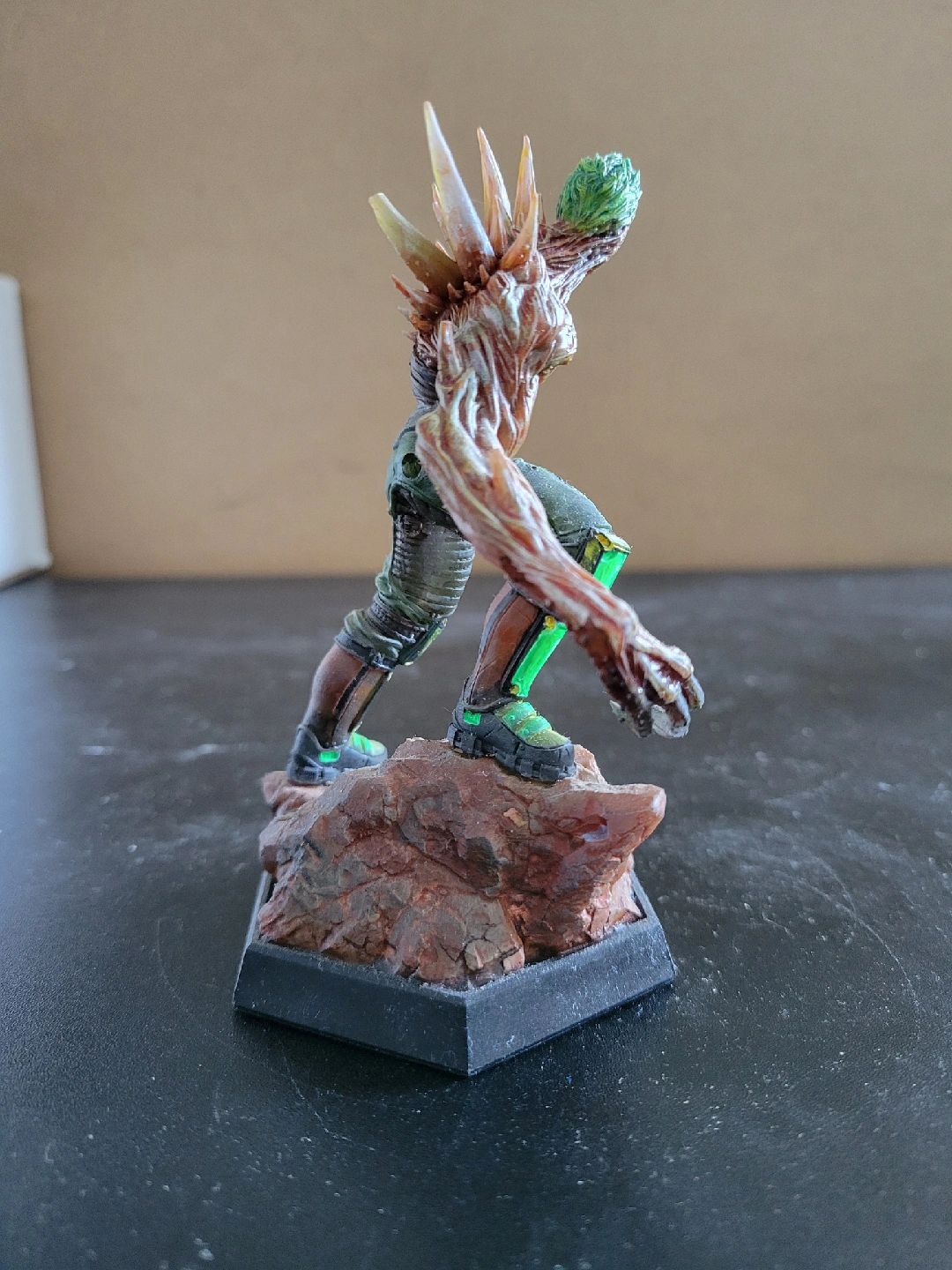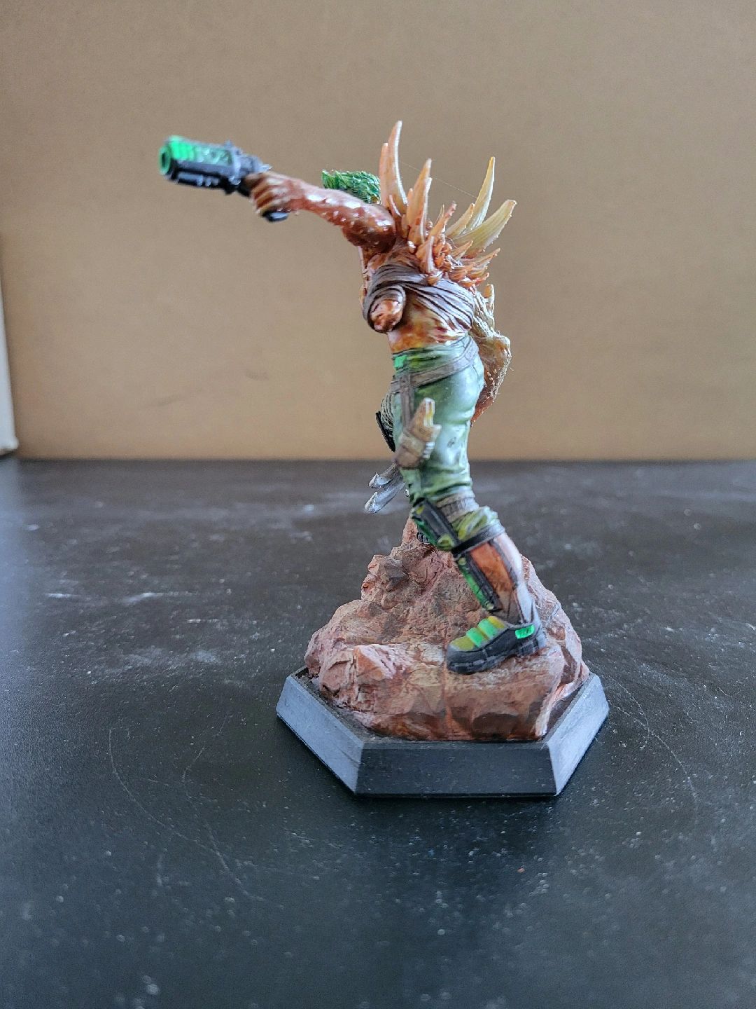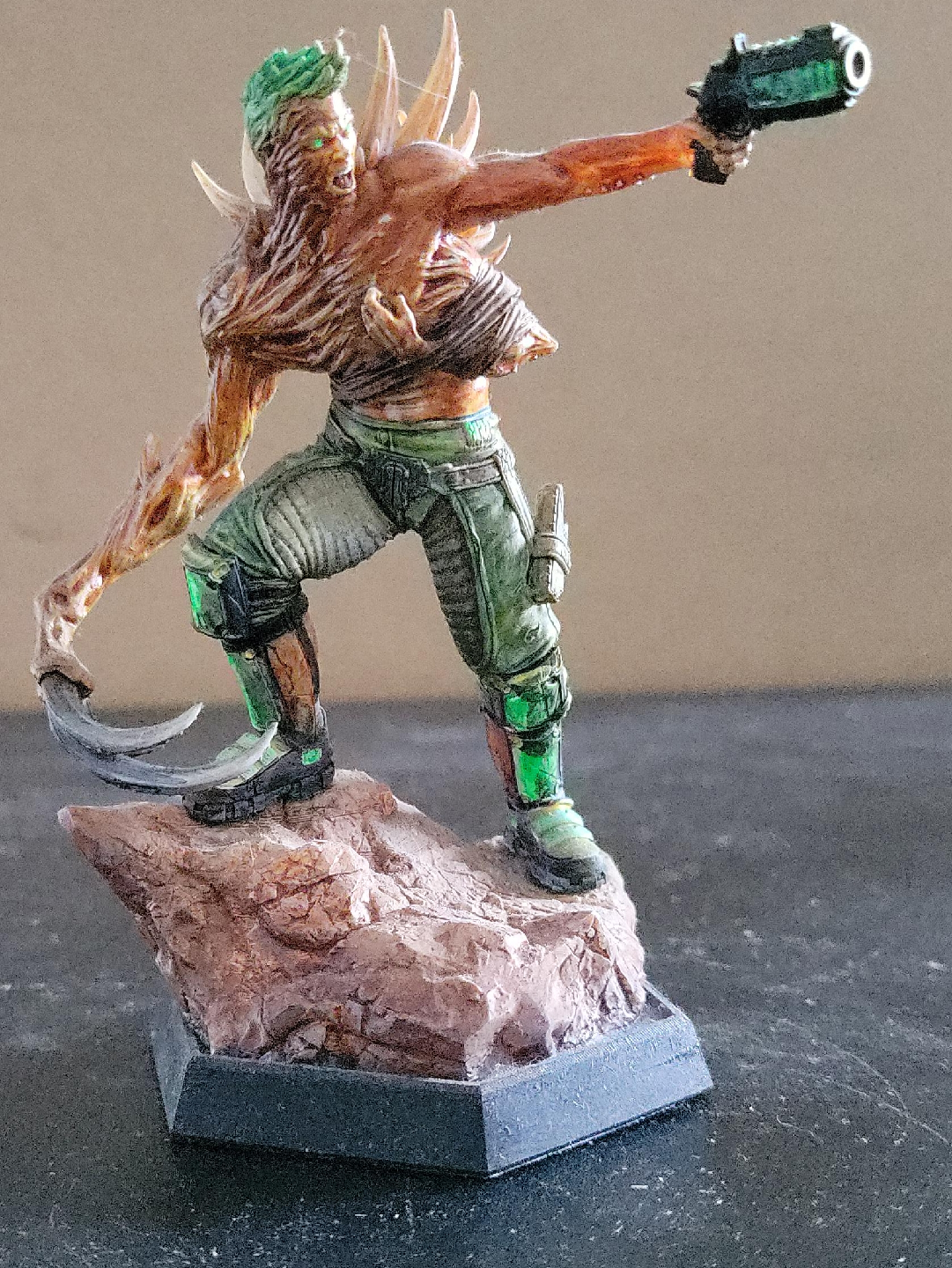 It features a post-apocalyptic bio-mutant with large claw and a gun standing on a rock base. Painted in painted in shades of orange and green. It could be a great addition to a collection or for tabletop gaming! Non-smoking household. No drop-offs.