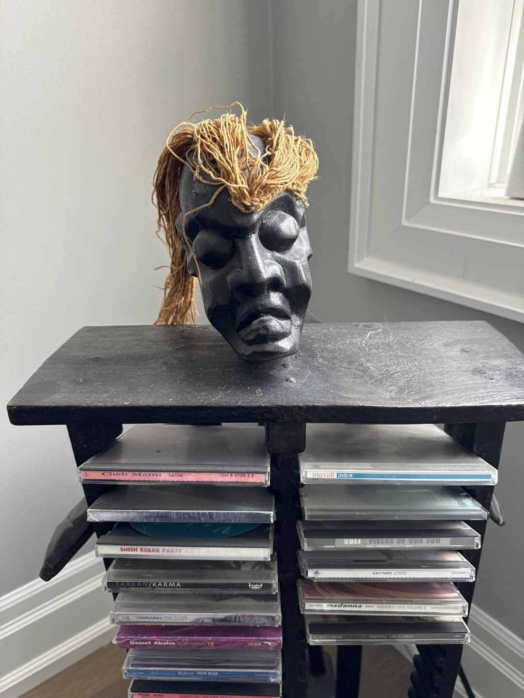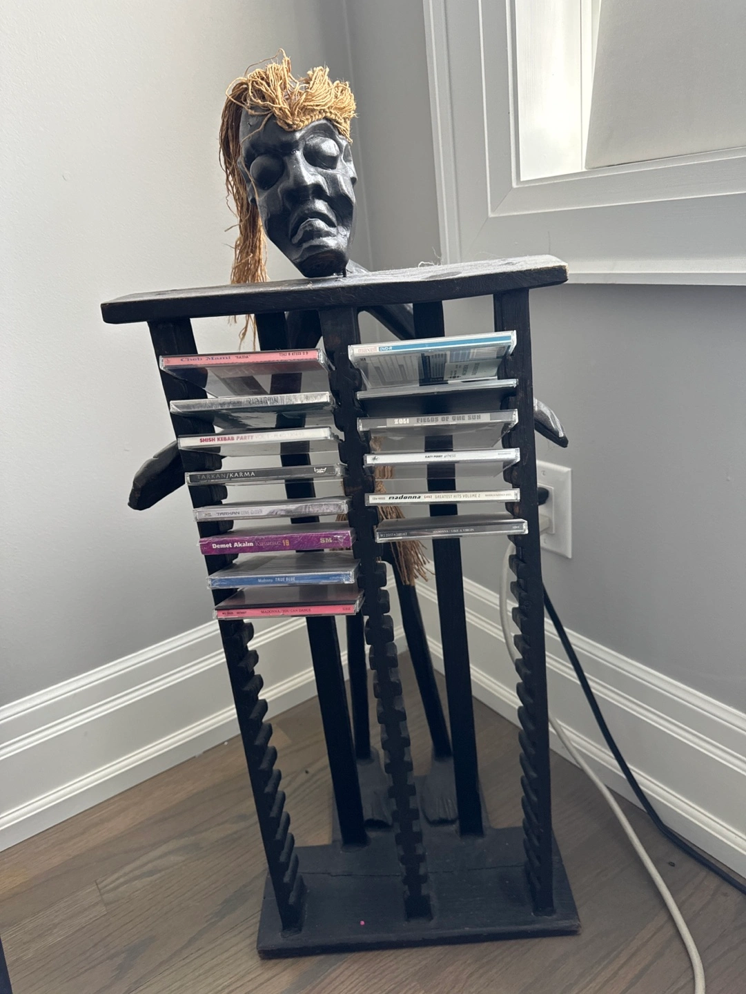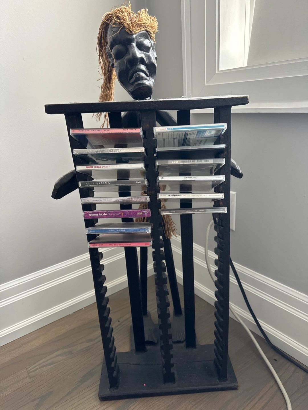 Intriguing CD storage solution. Features a dark stained wooden rack and a carved wooden figure. Holds numerous CDs. Excellent conversation piece.