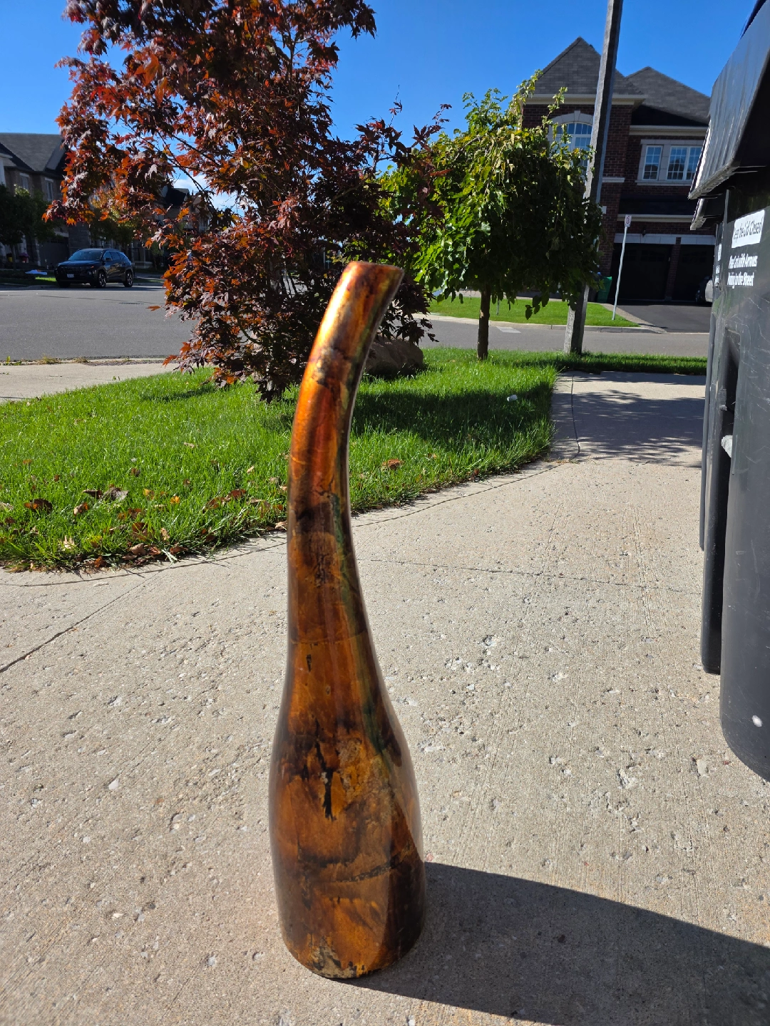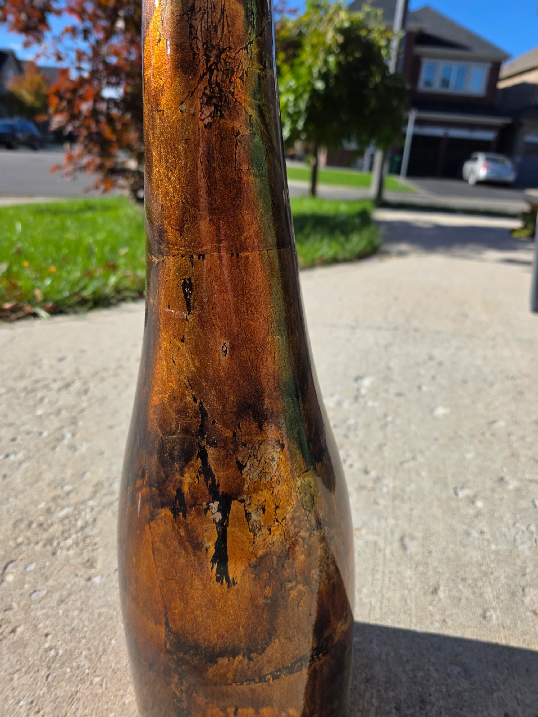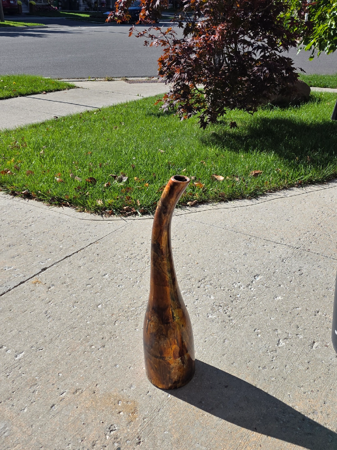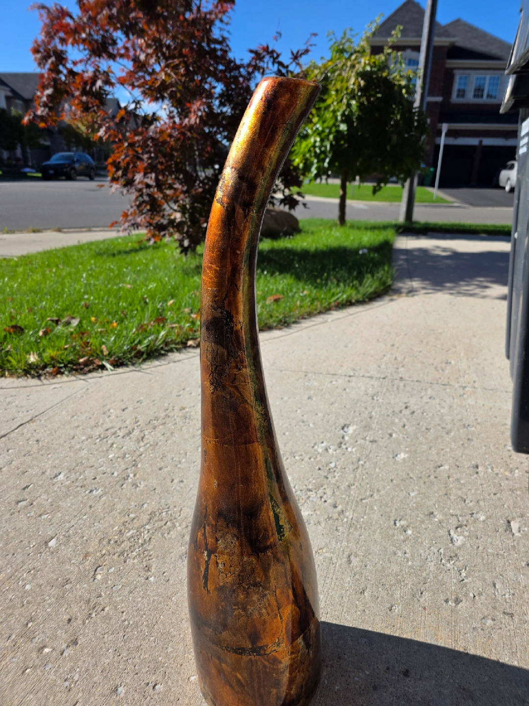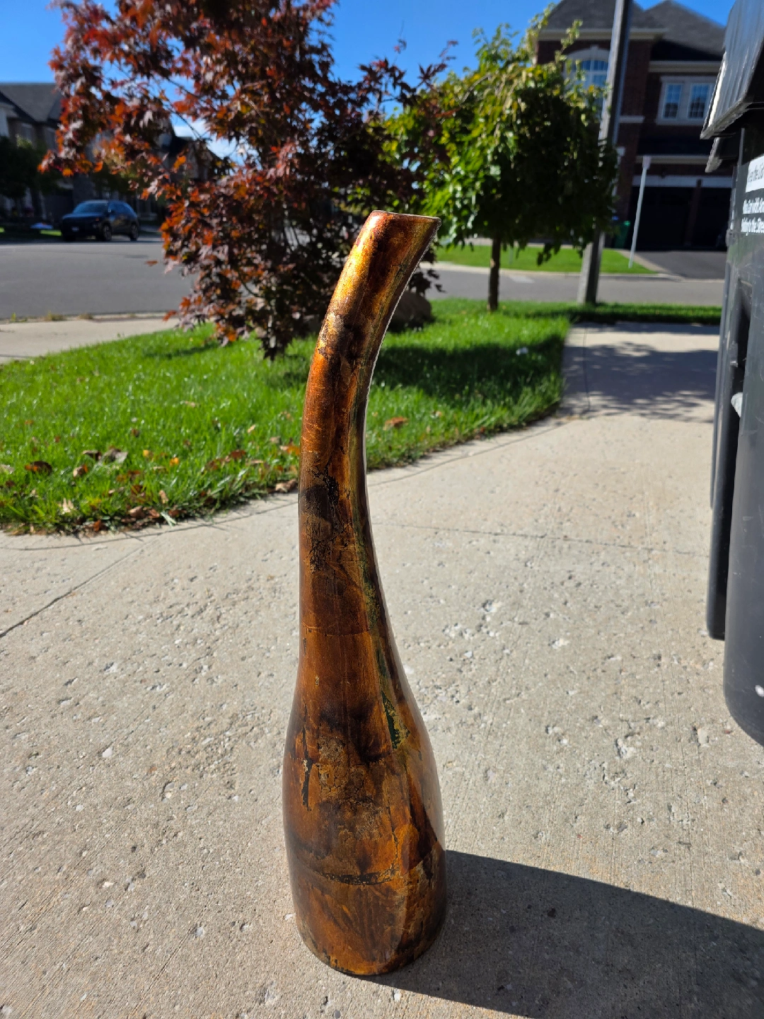 Selling a unique decorative vase with a beautiful brown and gold finish. It's in great condition and would make a lovely addition to any home decor $7