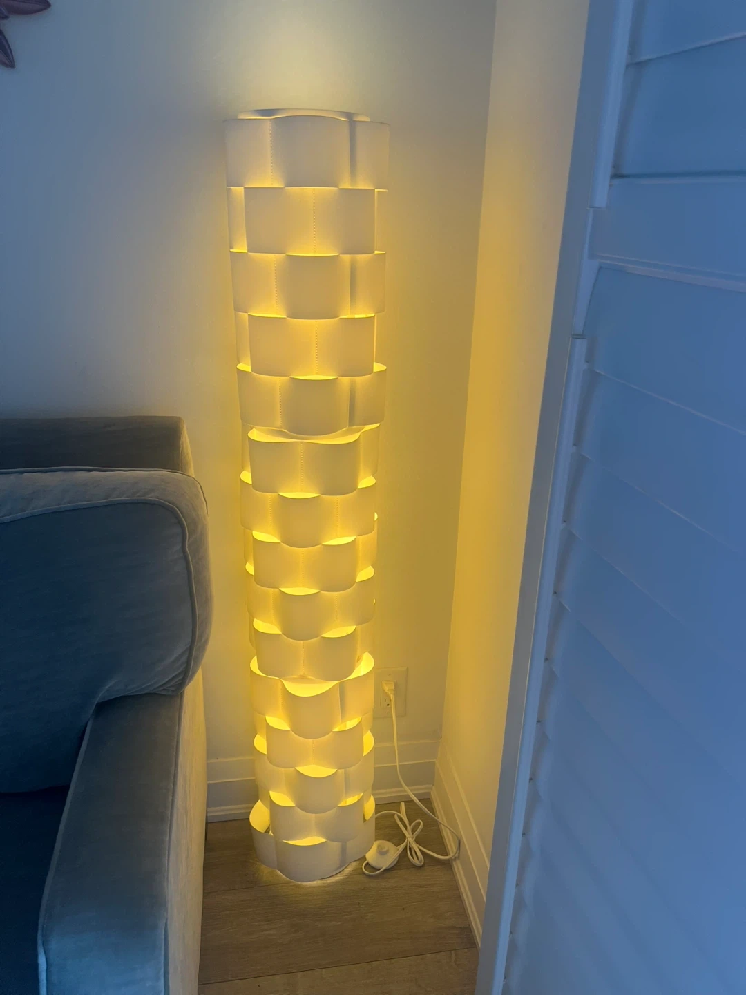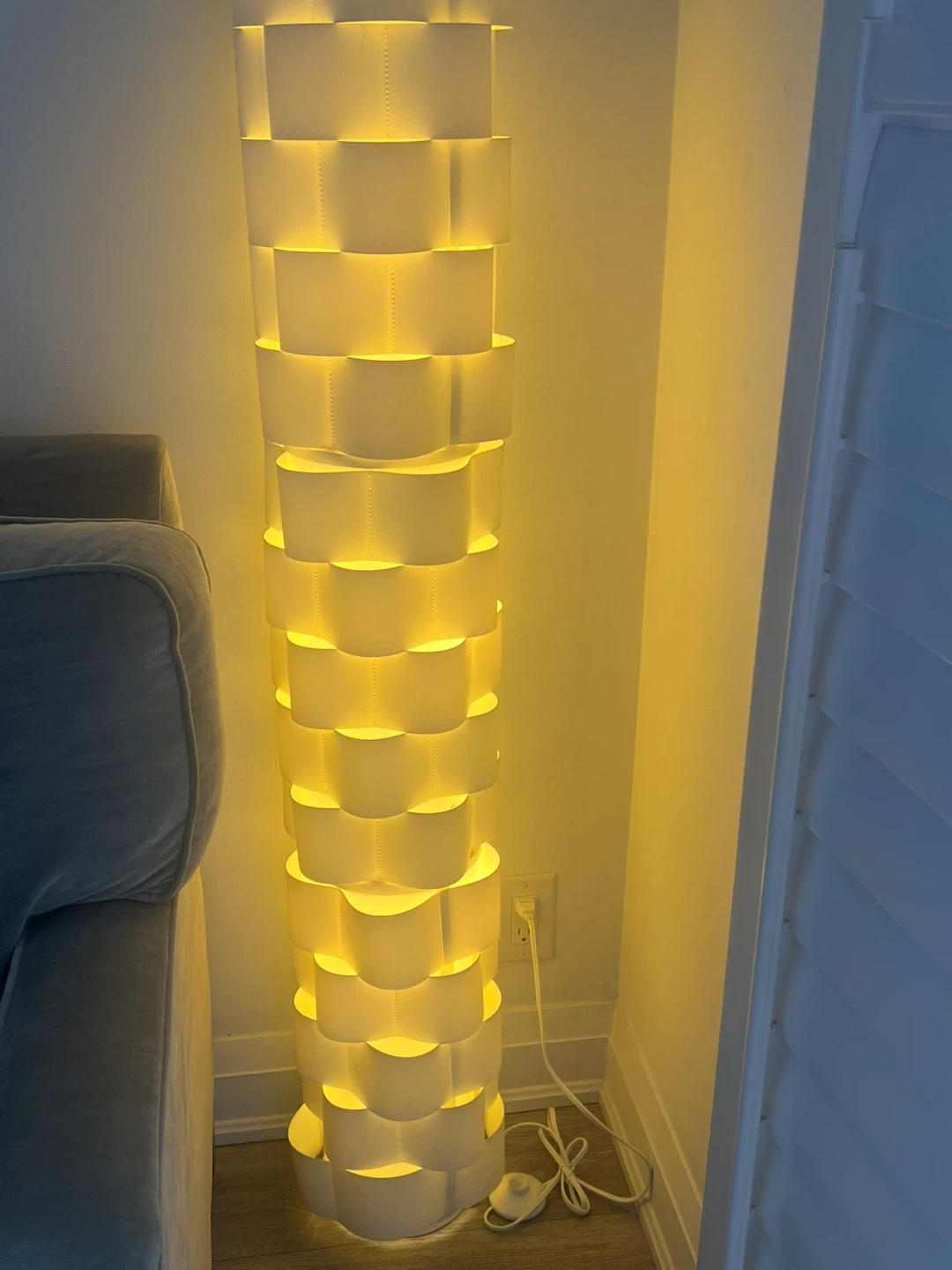Check out this unique floor lamp! It's a one-of-a-kind piece, perfect for adding a bit of creative flair to any room. It provides a warm and inviting glow, making it great for cozy evenings or as a statement piece in your living space
