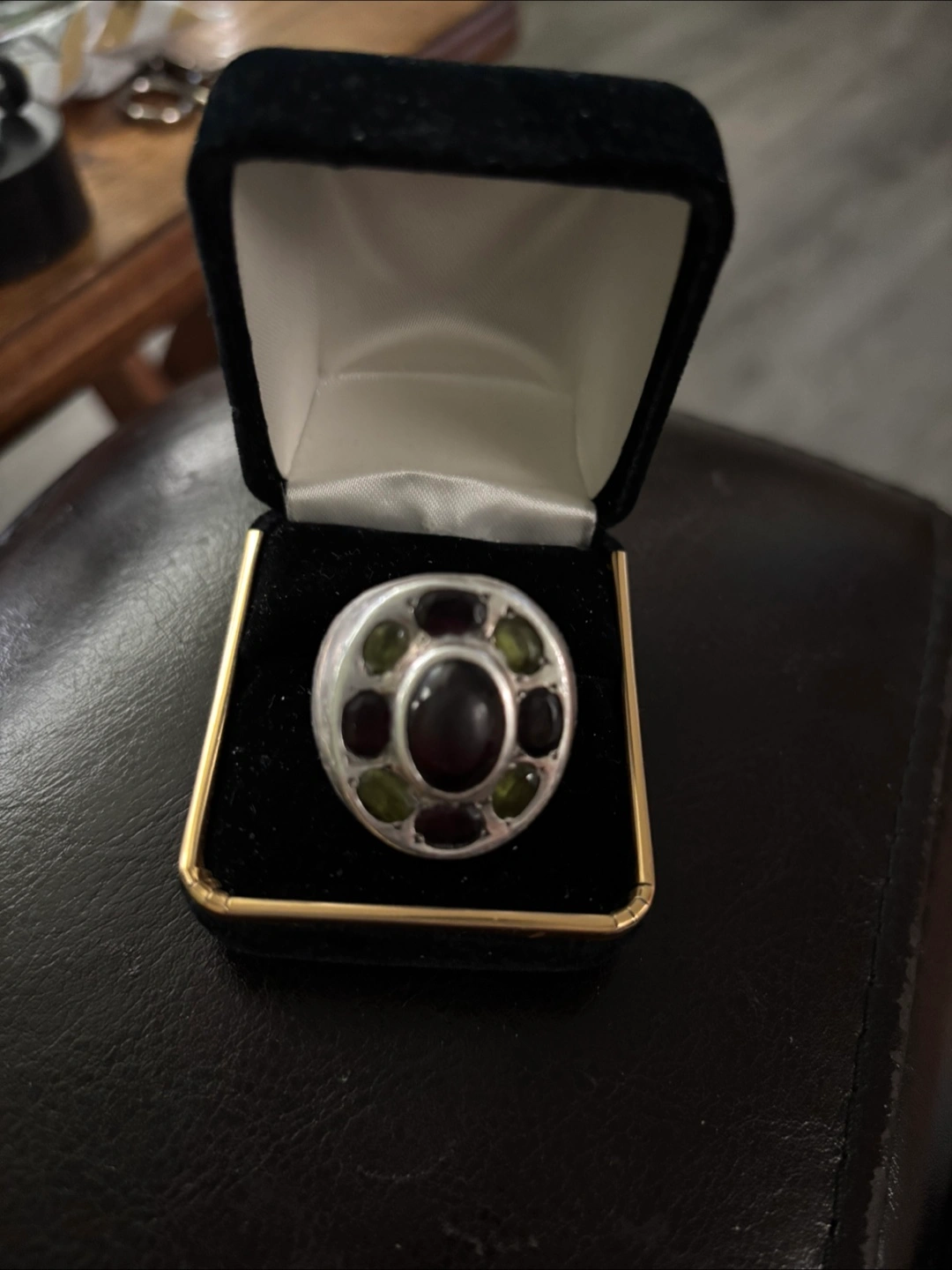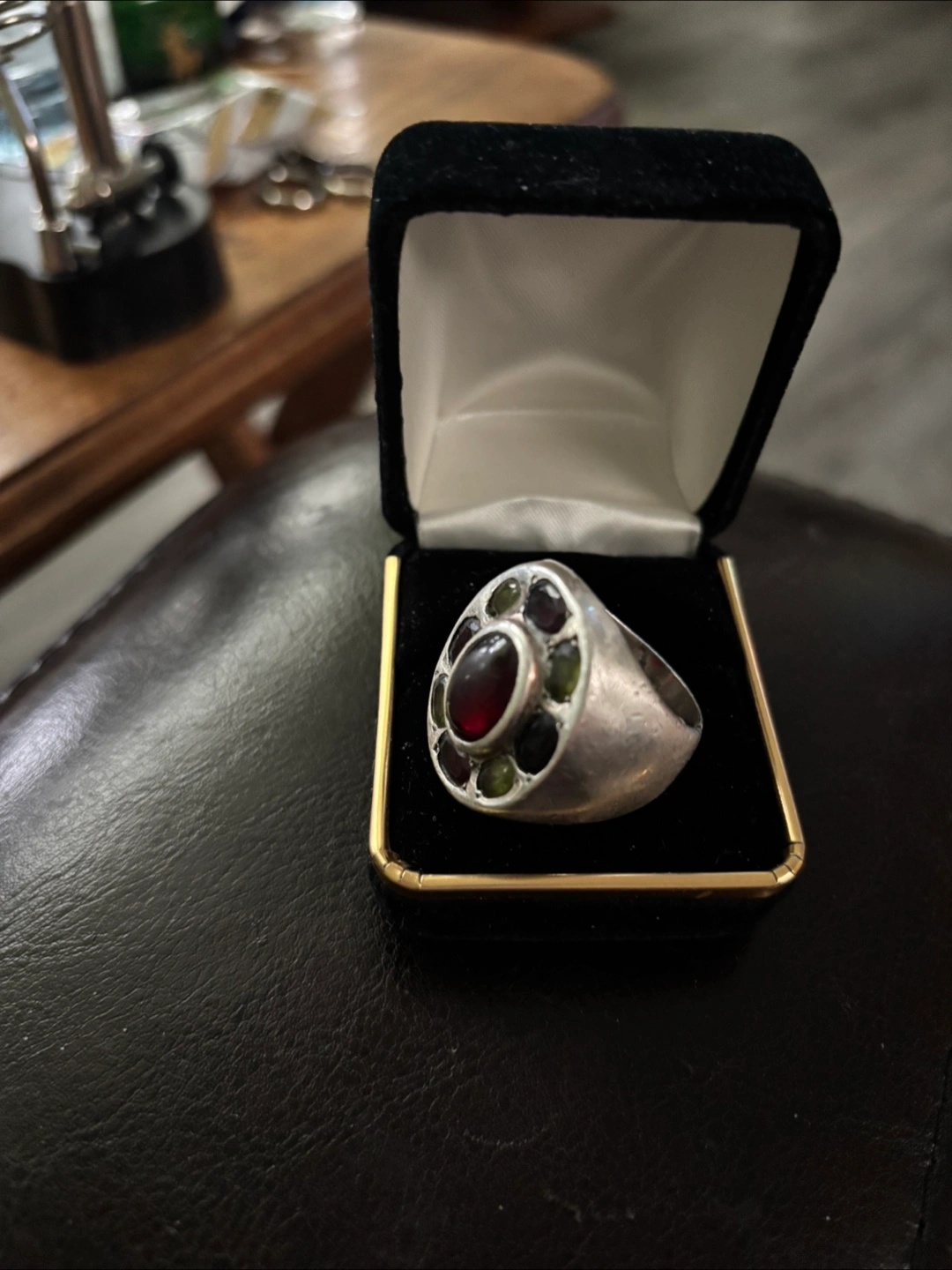 Men's custom ring. Features a large dark red garnet surrounded by smaller green peridot and garnet stones. Sterling Silver band.