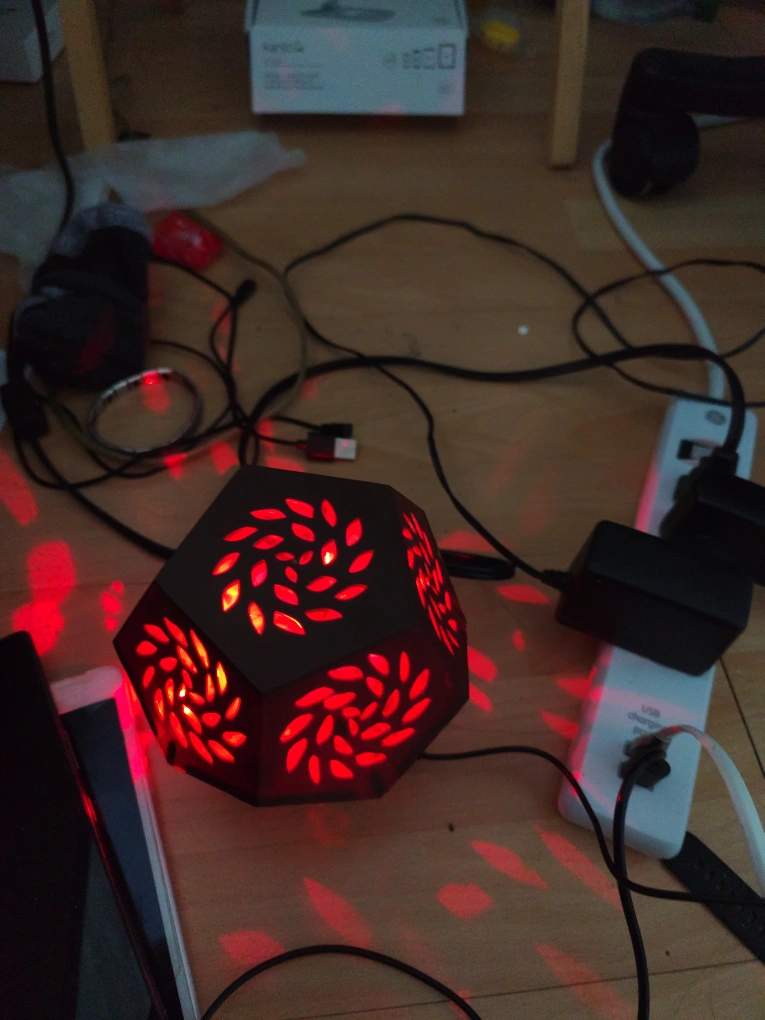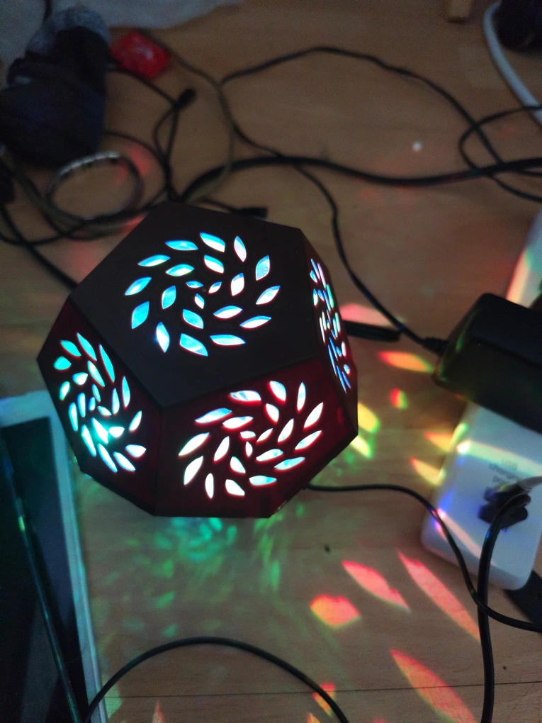 Geometric lamp, dark brown colour. Intricate cut-out design. LED lights project colourful patterns. party ๐ room plug in( micro)