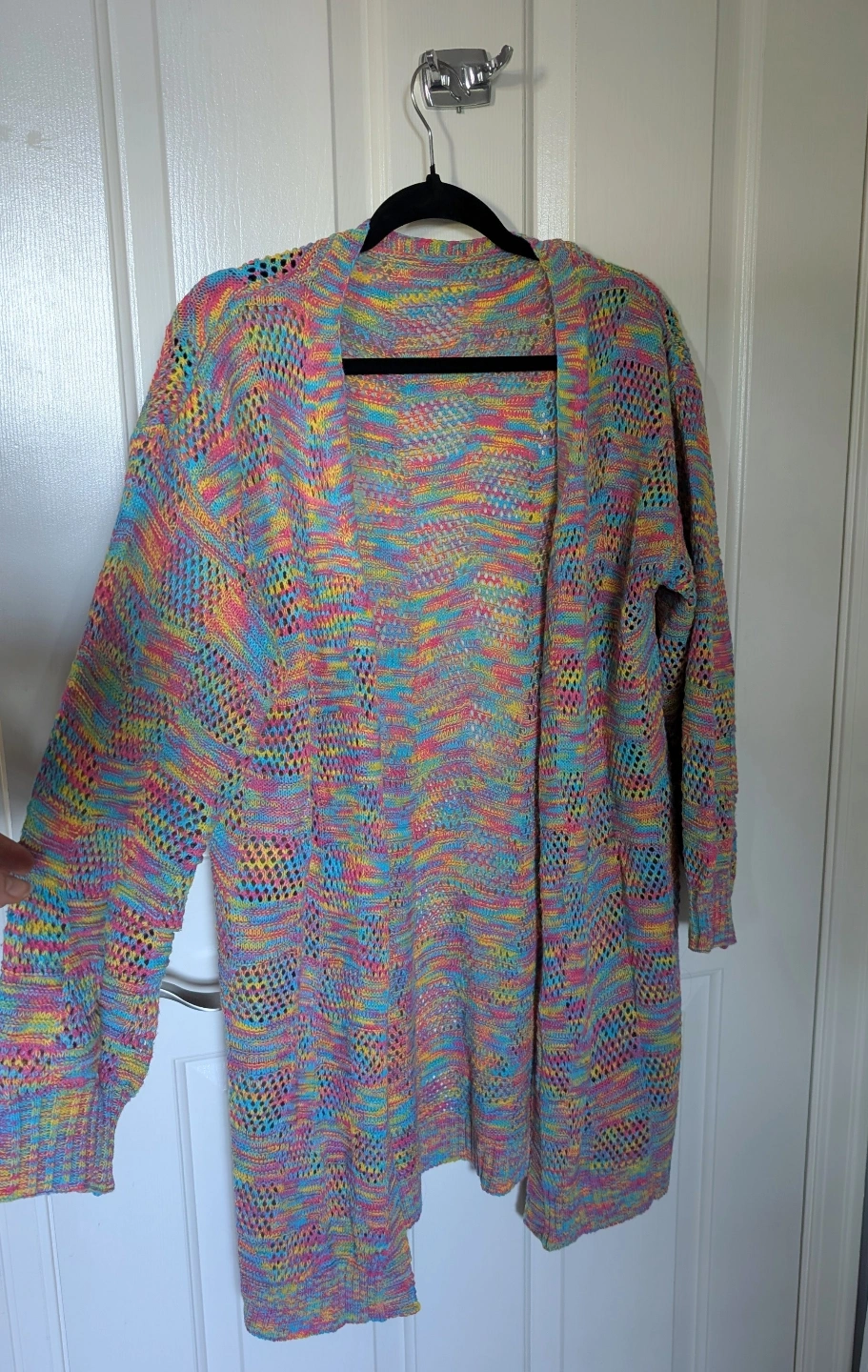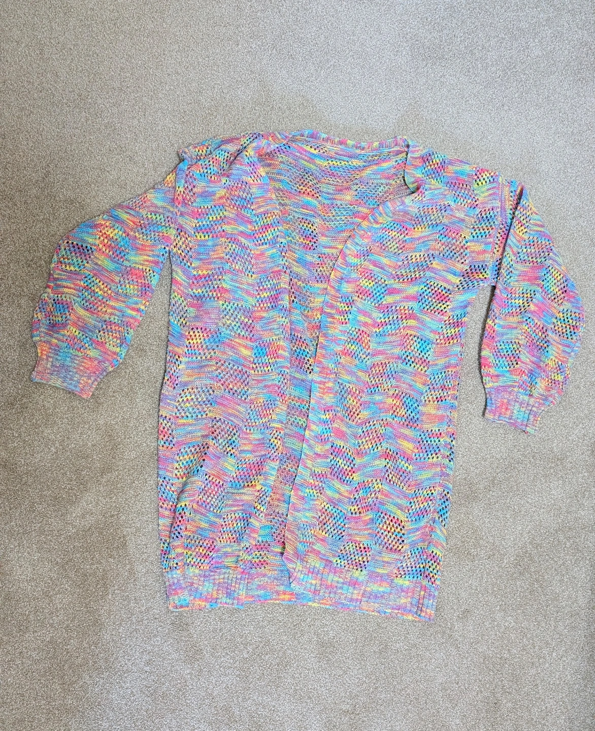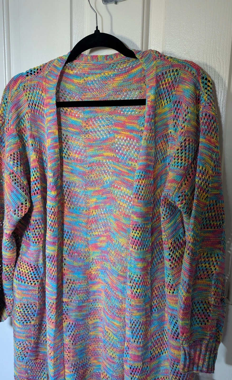Unique Rainbow lightweight open knit cardigan. Relaxed fit and great for layering in spring or summer. A longer sweater - 35 inches from shoulder line to bottom hem. Sleeves are 21 inches from shoulder to cuff. It's quite roomy, so could fit L to XL depending on style wishes. Excellent condition.