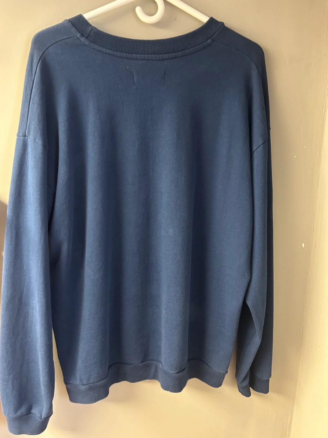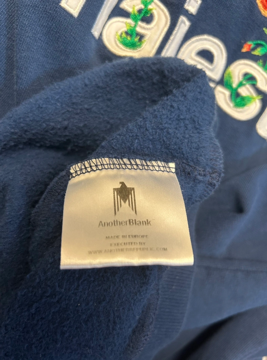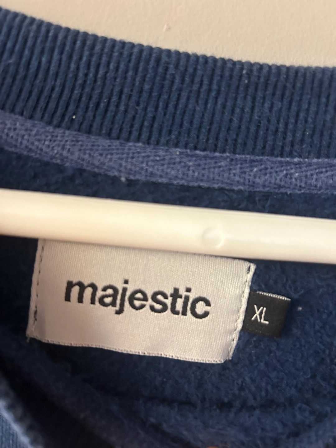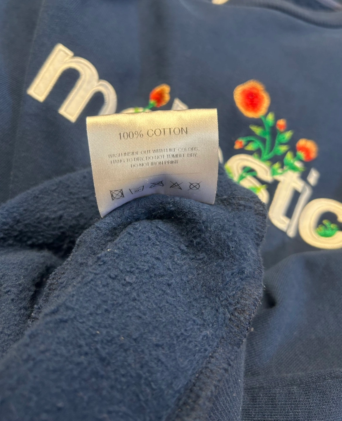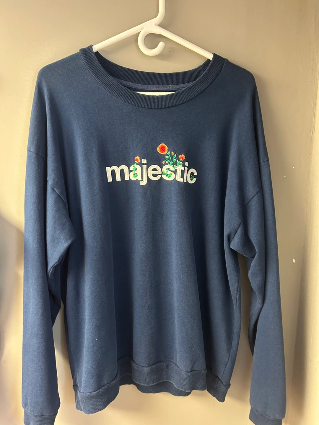 Another Blank navy blue crewneck sweatshirt. Features embroidered Majestic logo with floral accents. 100% cotton. Made in Europe. ( No stains or rips )