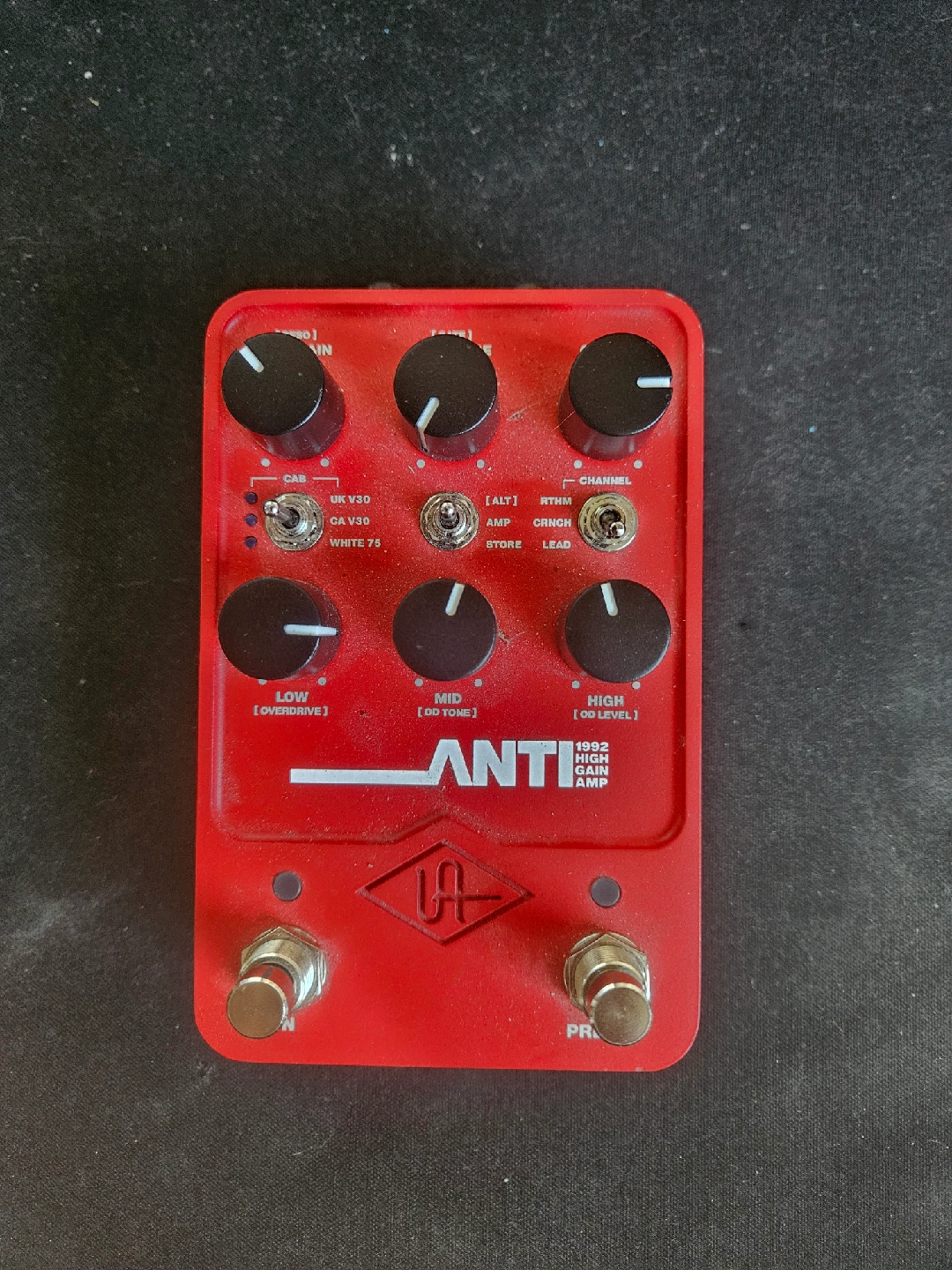 Selling a Universal Audio UAFX Amp Pedal in red. It has controls for cab, channel, overdrive, and tone. There are settings for UK V30, CA V30, and White 75, as well as amp, crunch, store, and lead settings. It also has high gain amp settings. Great for guitarists!