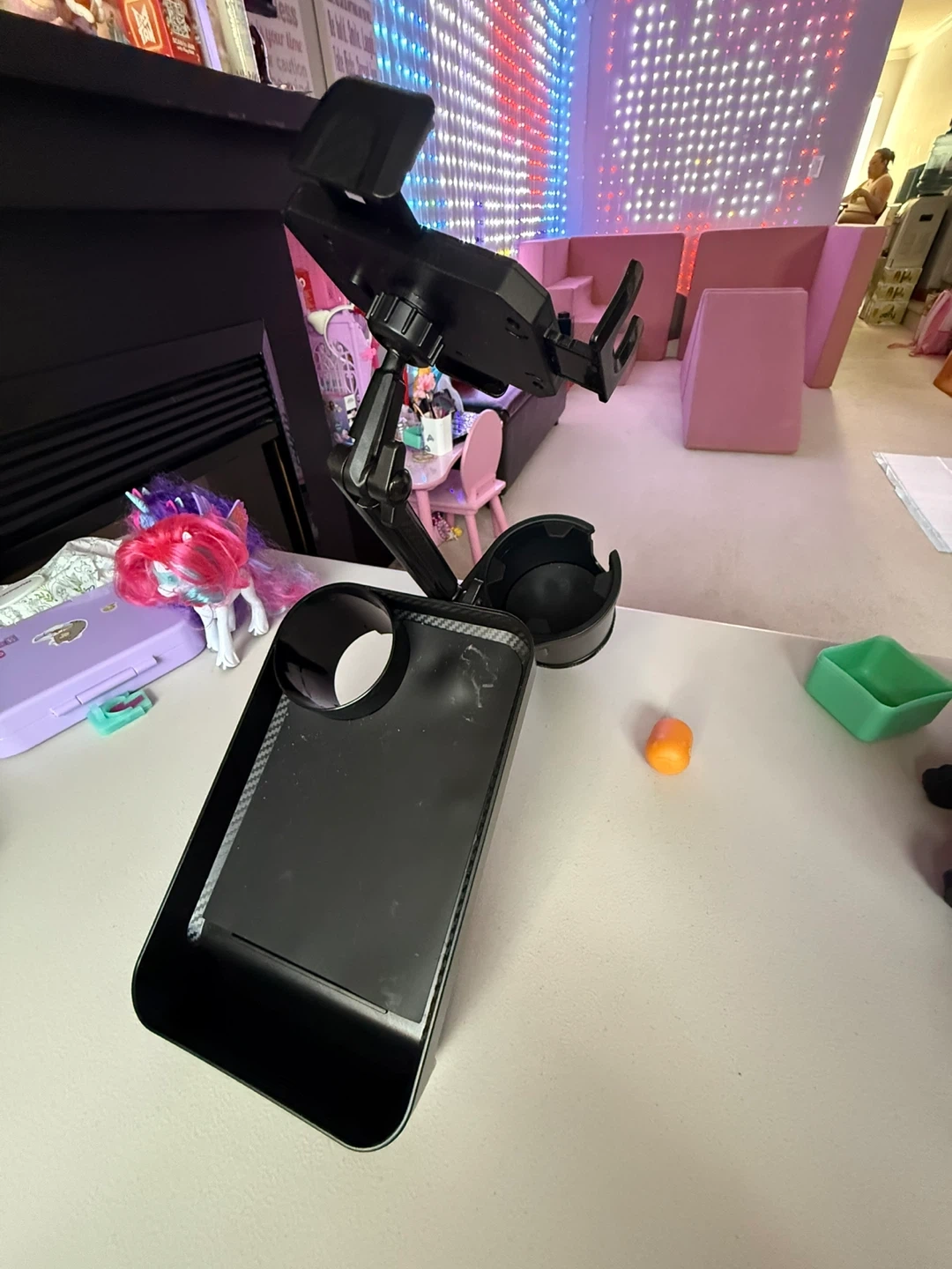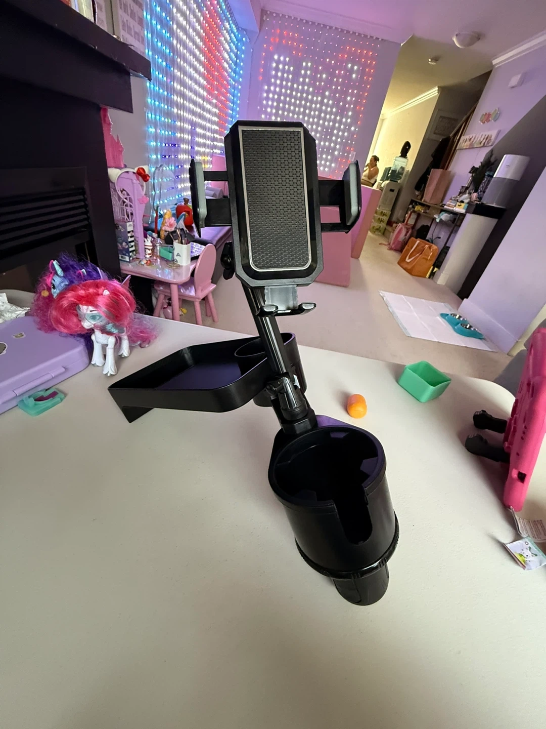 This is a universal car phone mount that comes with a tray and cup holder! It's super convenient for keeping your phone and drinks secure while driving. Great for anyone who spends a lot of time in their car and wants to stay organized