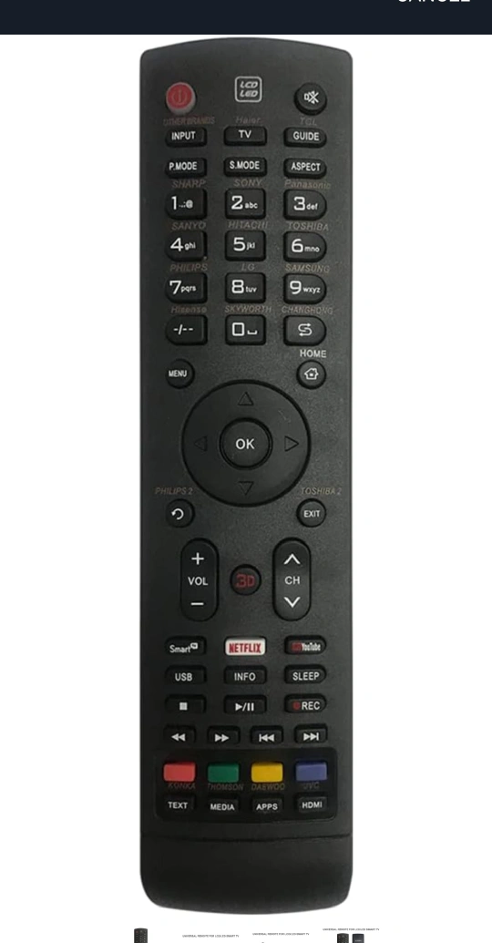 This is a universal remote for LCD/LED Smart TVs. It's black and in great shape. It has buttons for a variety of brands including Sony, Samsung, LG, Philips and more! It also has buttons for Netflix and Youtube